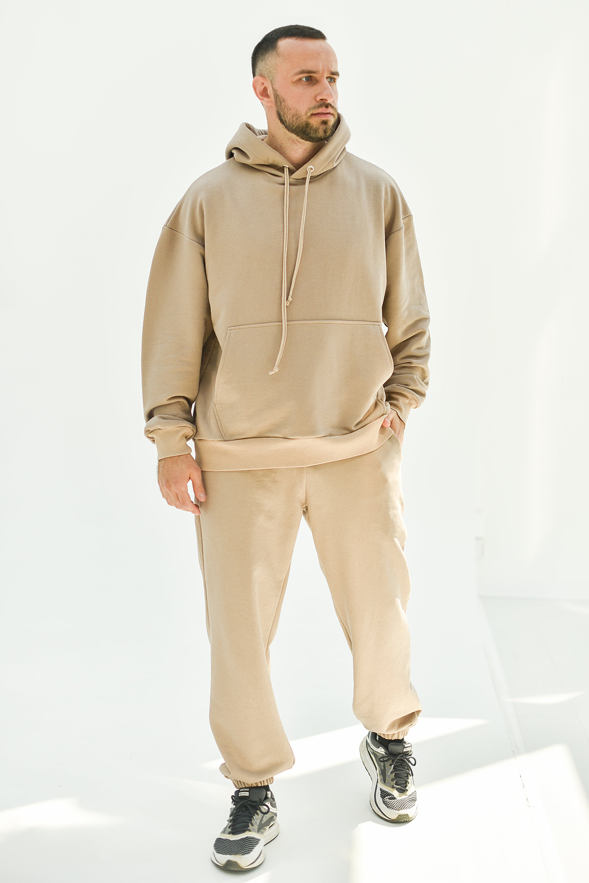 Костюм мужской спортивного стиля из петельчатого полотна «футер» 3-х нитка , состоящий из толстовки и джоггеров. Толстовка свободной формы со спущенным втачным рукавом; капюшоном и вышивкой на полочке, манжетами по рукавам и низу из трикотажного полотна «кашкорсе». На капюшоне люверсы и шнур, для регулировки объёма по горловине. Капюшон на подкладке из х/б трикотажного полотна-«кулирка». Джоггеры также свободной формы, с боковыми карманами, отрезным поясом на резинке. По поясу брюк кулиса, позволяющая регулировать объём изделия. Низ брюк собран на резинку. Костюм отлично подойдёт как для занятий спортом, так и вечерних прогулок.