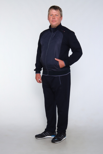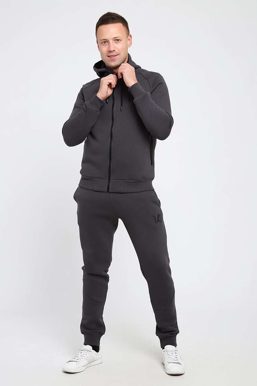 Мужской костюм изготовлен из качественного футера 3-нитки с начесом. Отличный зимний вариант спортивной одежды. Толстовка на молнии, с капюшоном, дополненным шнуром. Два глубоким прорезных кармана так же с молниями, украшенными пуллерами. На груди выполнена аккуратная вышивка-логотип. Так же текстовая вышивка расположена на рукаве. Брюки сзади на кокетке, что способствует удобной посадке. Карманы без молнии. Низ брюк на манжете.