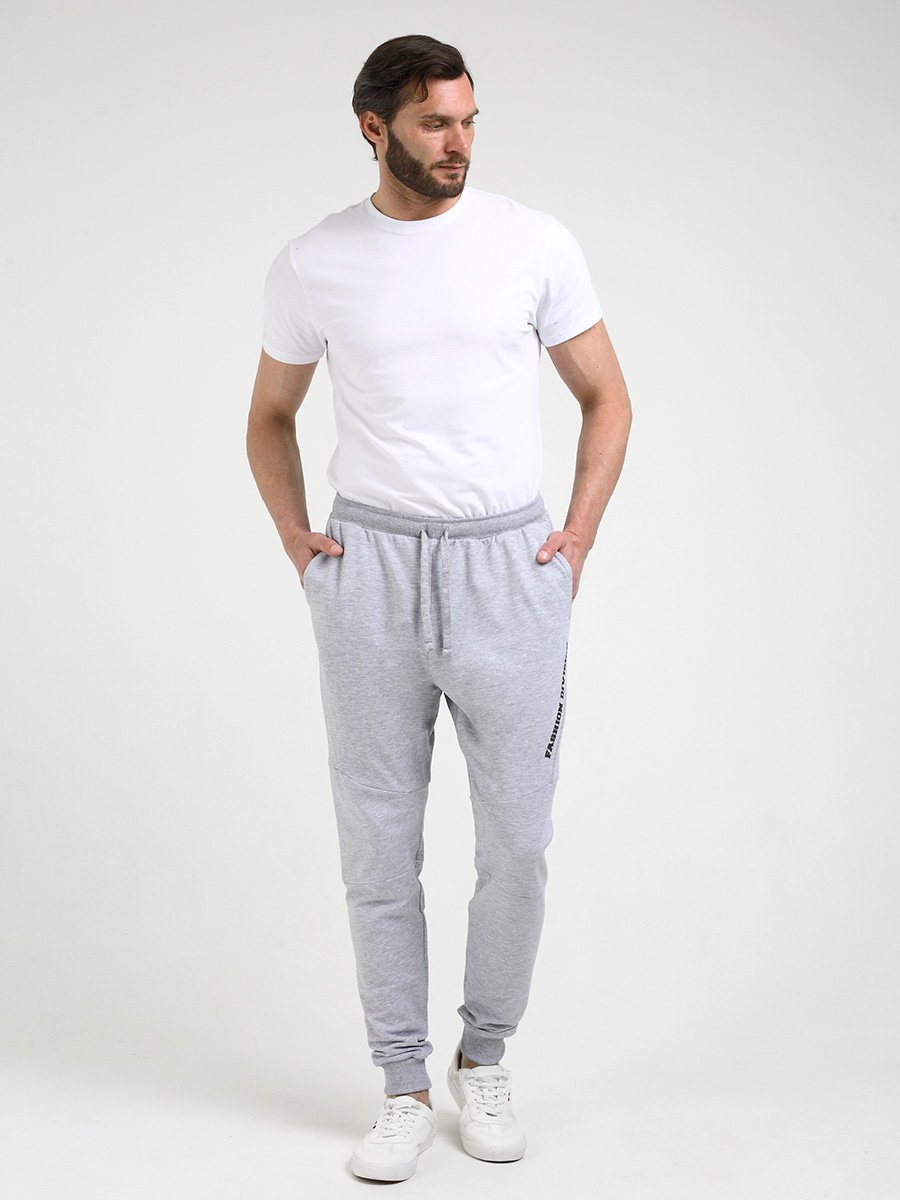 Трикотажные мужские брюки из хлопка с добавлением полиэстера, мягкие и приятные на ощупь, не сковывают движения, обеспечивая максимальный комфорт. По низу плотно прилегают к ноге, в верхней части сидят свободно. Без боковых швов.  На передних половинках вместительные карманы. По низу брюки на манжетах.  По поясу собираются широкой резинкой.  Дополнительно в поясе имеется шнур.