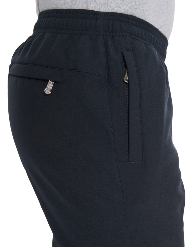 Джоггеры с поясом на резинке. Отшиты из ткани Windstopper Softshell для спорта и активного отдыха. Ткань представляет собой трёхслойную систему, состоящую из лицевой ткани (эластичный полиэстер), мембраны (защита от ветра и паропроницаемость) и утеплителя (флис), соединенных в единое целое. Благодаря такой структуре обладает водоотталкивающими свойствами и в то же время пропускает водяной пар, т.е. способна "дышать". Наличие нитей эластана делает ткань подвижной, а изделие более комфортным. Для дополнительной фиксации в пояс с внутренней стороны вставлен шнурок. Брючины заужены книзу и заканчиваются манжетами. Передние карманы на молниях под листочками. Сзади кокетка, под которой расположен горизонтальный карман на молнии, прикрытый листочкой.