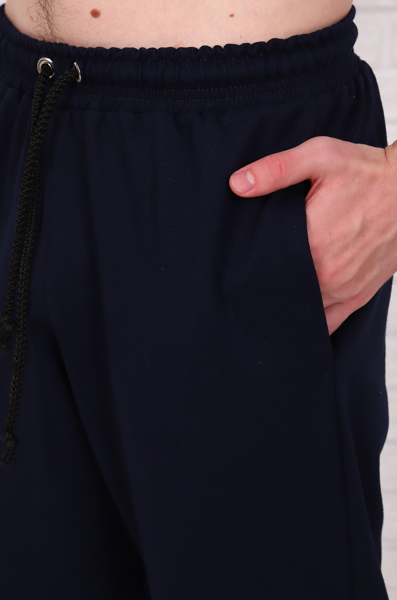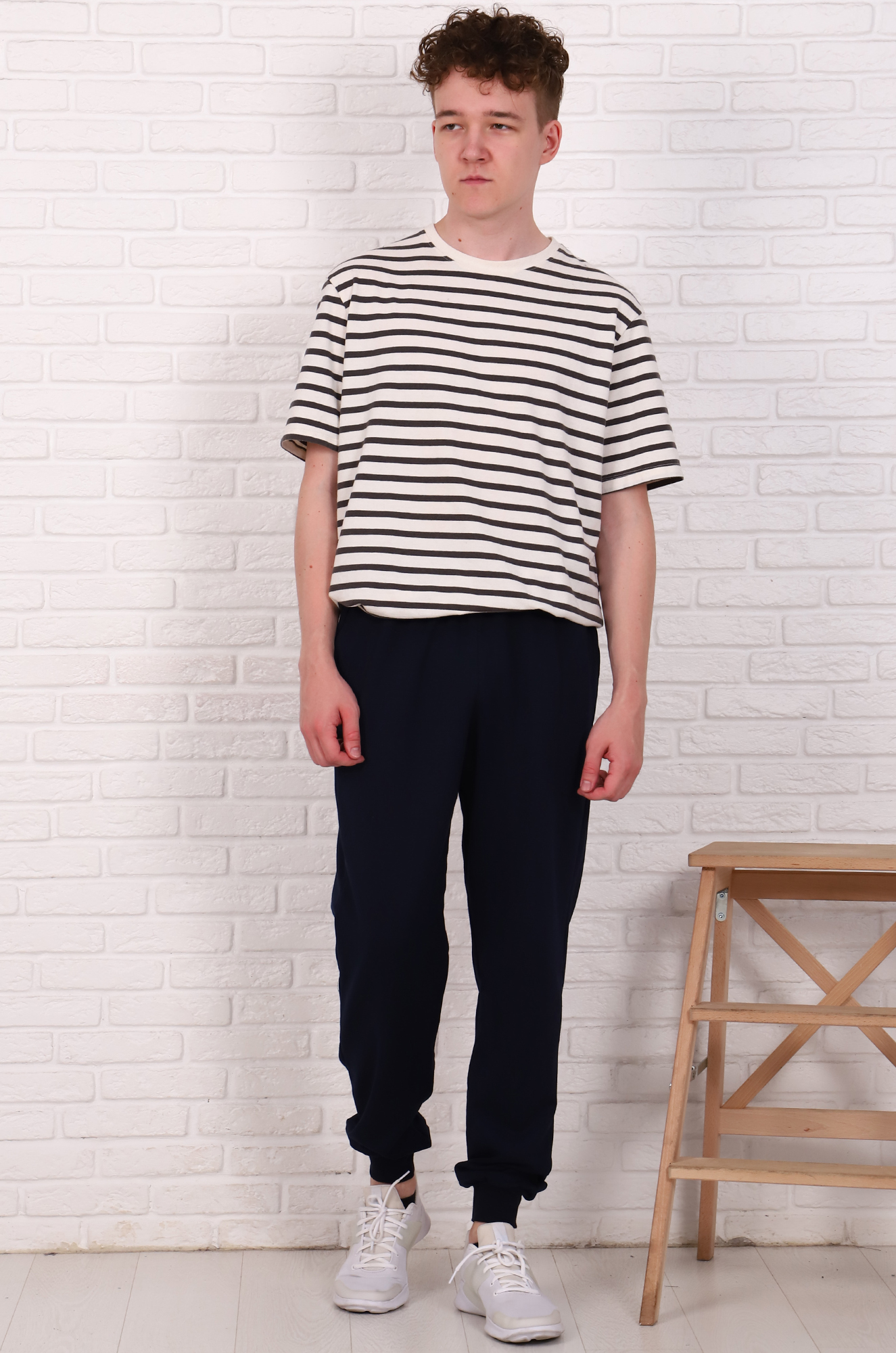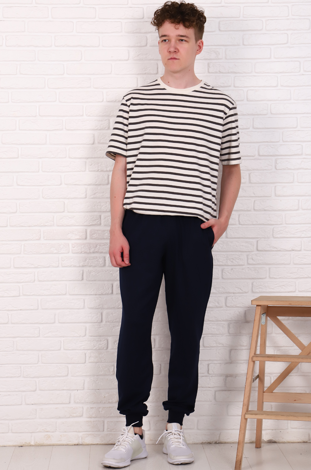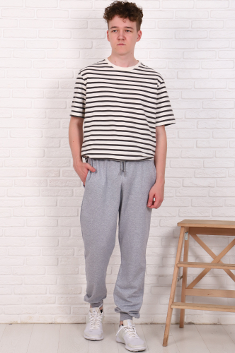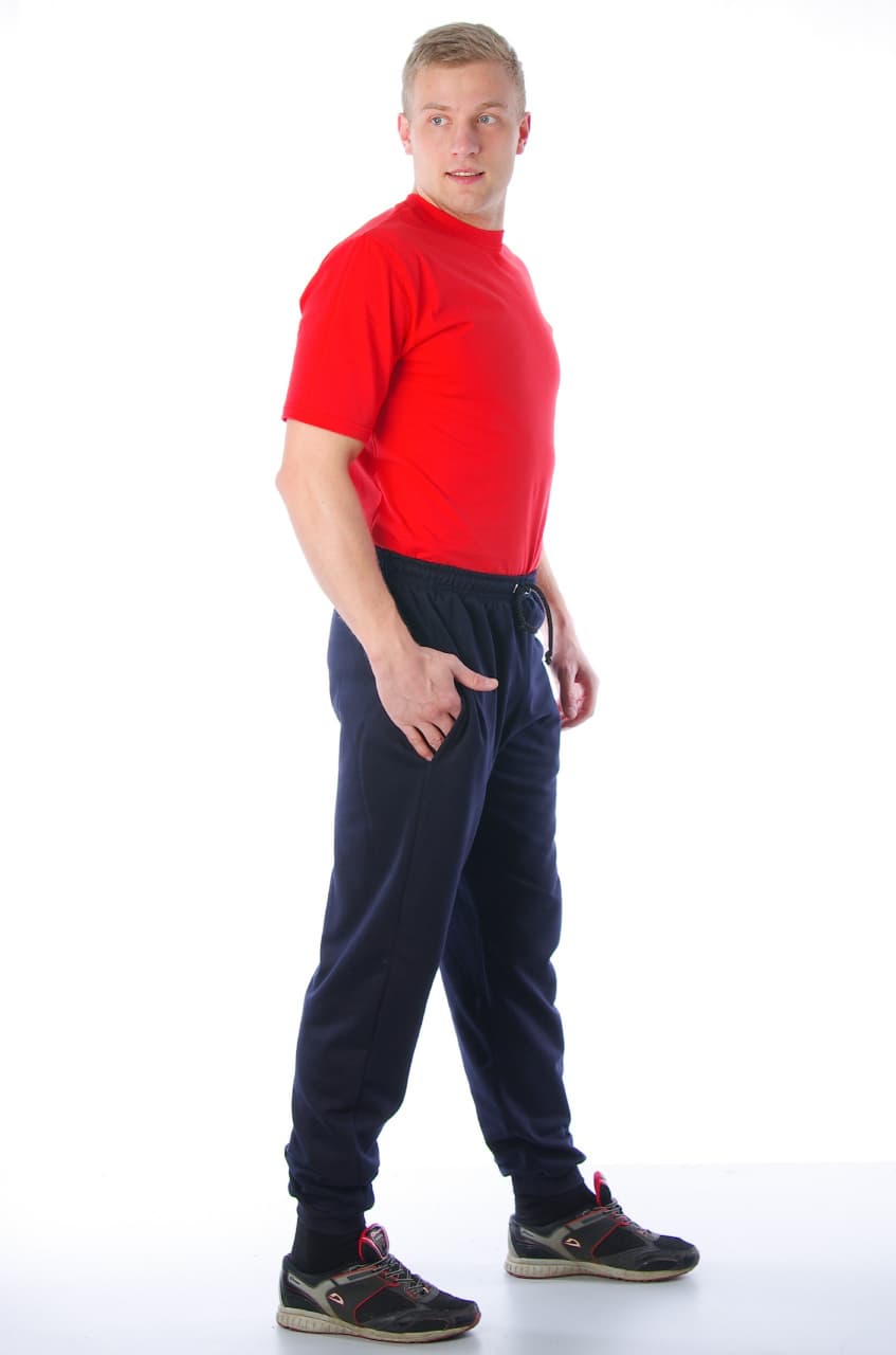 Мужские спортивные брюки на манжетах из облегчённого футера с небольшим начесом, плотностью 190 г/м2. Пояс на резинке и шнурок, боковые карманы.