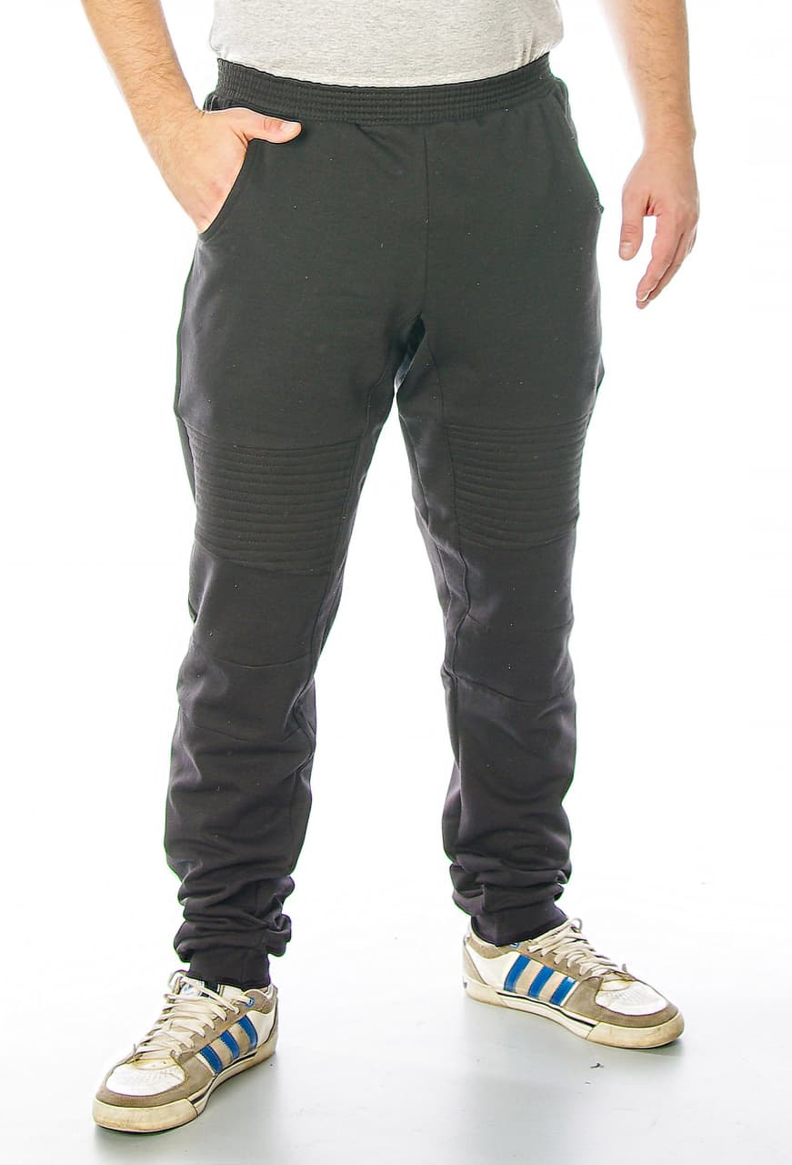 Модные зауженные спортивные брюки со стильной отстрочкой. Модель сложная, с отрезными деталями. Удобный пояс на резинке, внизу манжеты.