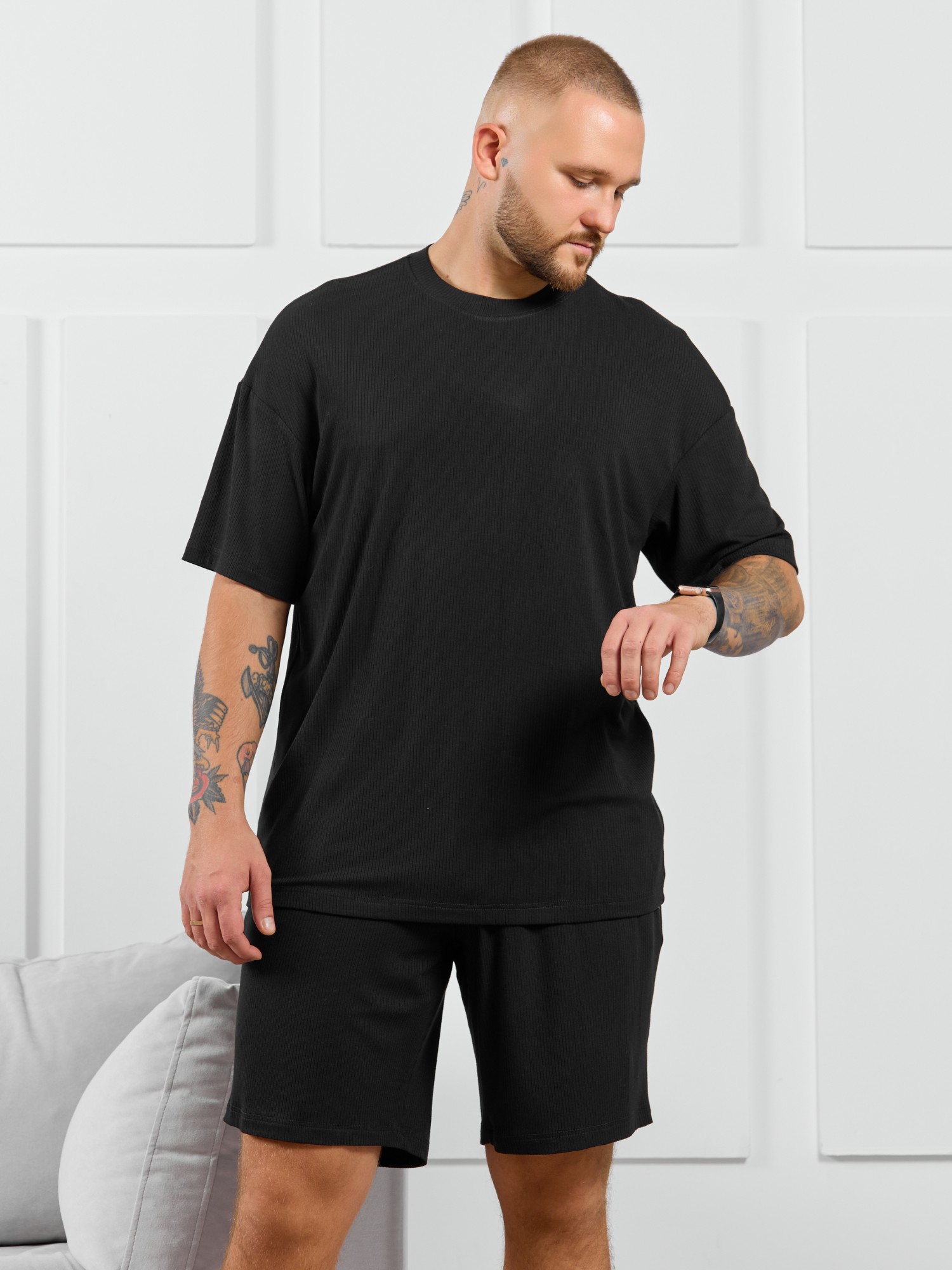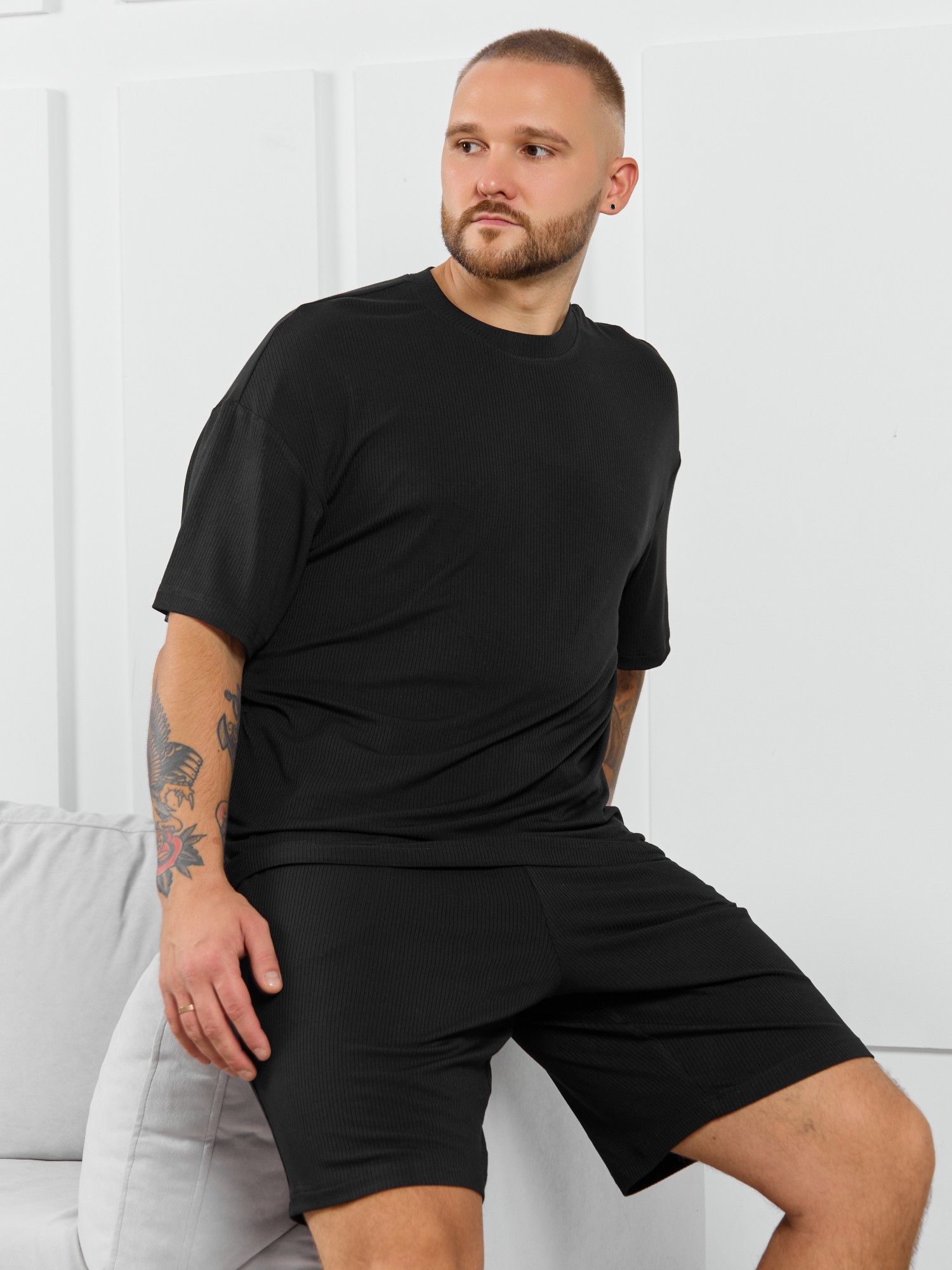Футболка мужская из пластичного однотонного трикотажного полотна в рубчик, приятного к телу. Модель свободная, со спущенной линией плеч, рукавами длиной до локтя. Может подойти для отдыха, прогулок и занятий спортом.