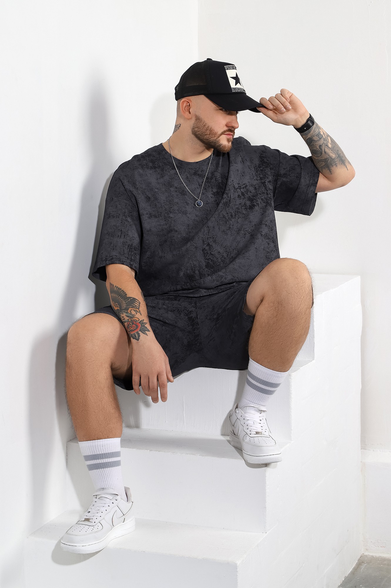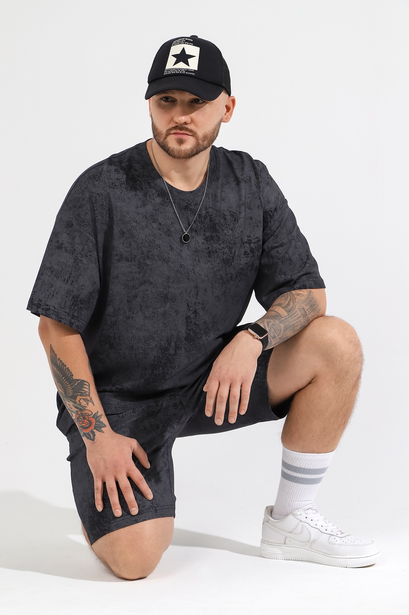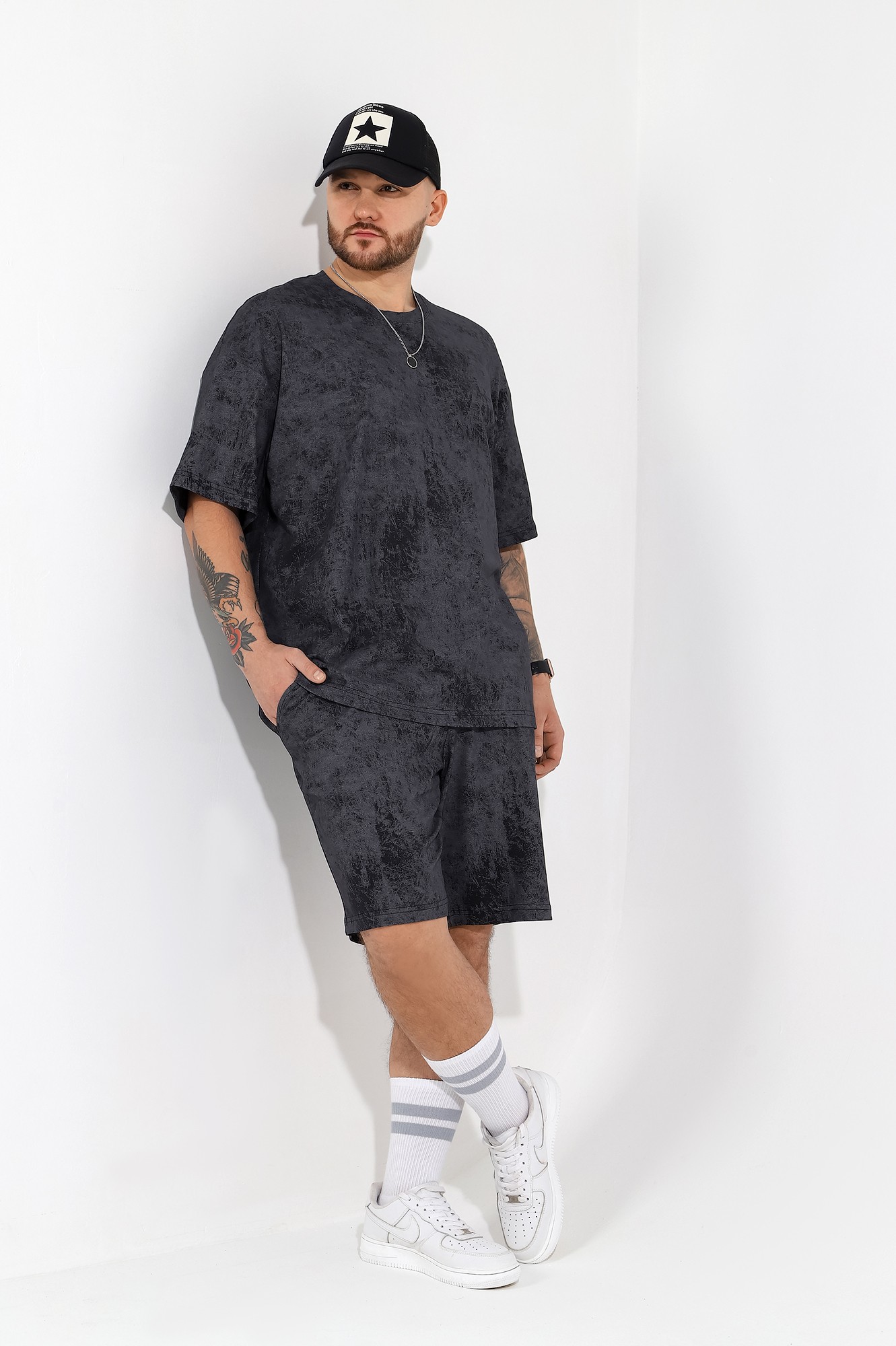 Костюм мужской, состоящий из футболки и шорт. Футболка - свободного покроя, короткими втачными рукавами и горловиной овальной формы, обработанной втачной планкой. По шву втачивания планки настрочена двойная отделочная строчка. Шорты - удлиненные, с карманами в боковых швах, на притачном поясе с эластичной тесьмой внутри.