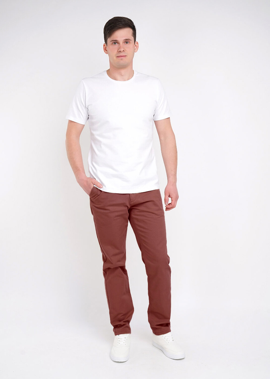 Прямые мужские хлопковые брюки средней посадки. Удобство обеспечивается за счет карманов: задних прорезных и боковых. Универсальный крой данной модели подойдет под любой повседневный образ и с футболкой и пиджаком.