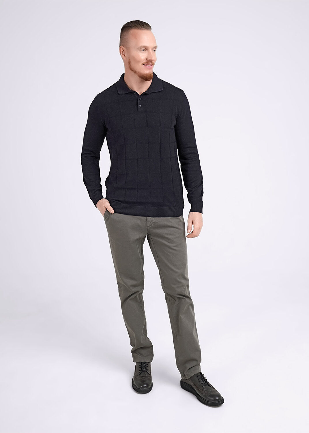 Мужское вязаное поло с длинным рукавом. Модель связана из приятной хлопковой пряжи с добавлением акрила в интересную фактурную клетку по передней стороне. Изделие можно сочетать как в классическом стиле, так и в повседневном.