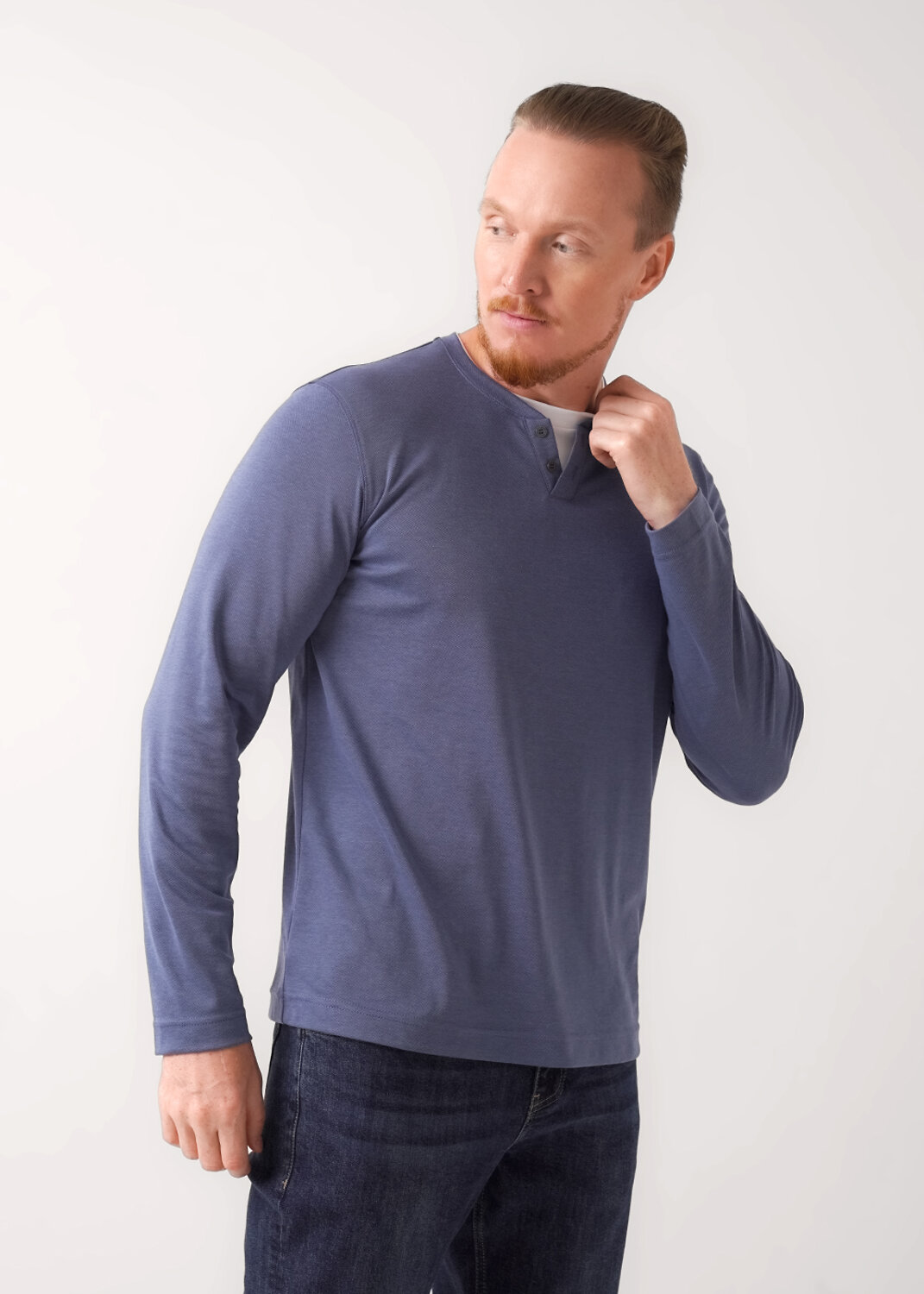 Лонгслив из трикотажного полотна "пике" с имитацией двойной горловины и удобной планкой на пуговицы. Данное изделие отличное дополнение к брюкам или джинсам. Прекрасно подойдёт для встречи с друзьями или похода на работу.