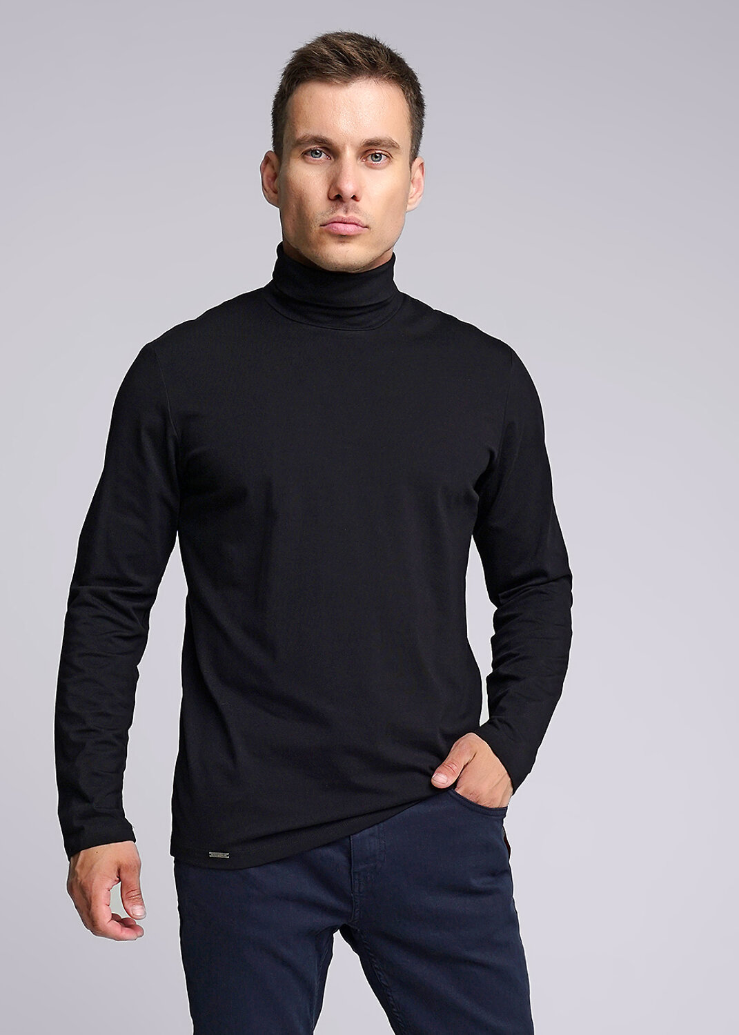 Базовый мужской лонгслив с длинным рукавом на воротнике стойке с загибом. Выполнен из дышащего хлопкового полотна. Лонгслив можно скомбинировать с брюками или джинсами. Отличное решение для похода на работу или встречи с друзьями.