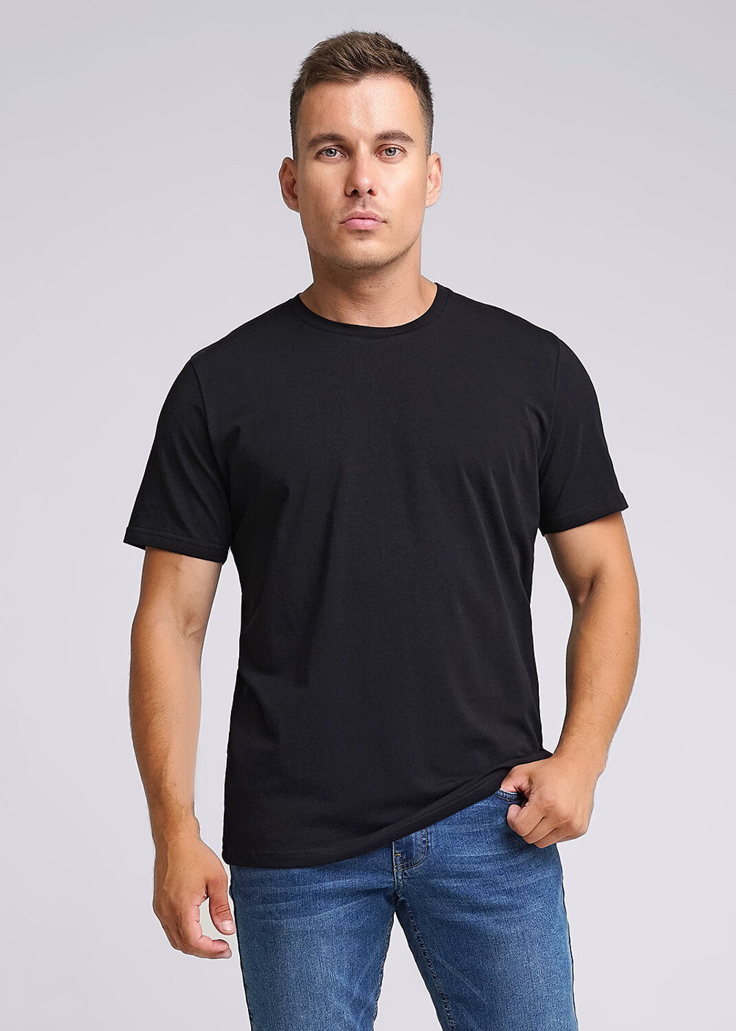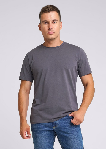Базовая однотонная футболка стандартного объема с круглой горловиной, втачным рукавом из хлопкового полотна с добавлением эластана. Является неотъемлемой частью мужского гардероба.