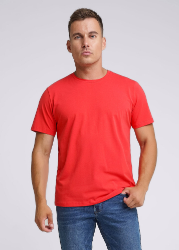 Базовая однотонная футболка стандартного объема с круглой горловиной, втачным рукавом из хлопкового полотна с добавлением эластана. Является неотъемлемой частью мужского гардероба.
