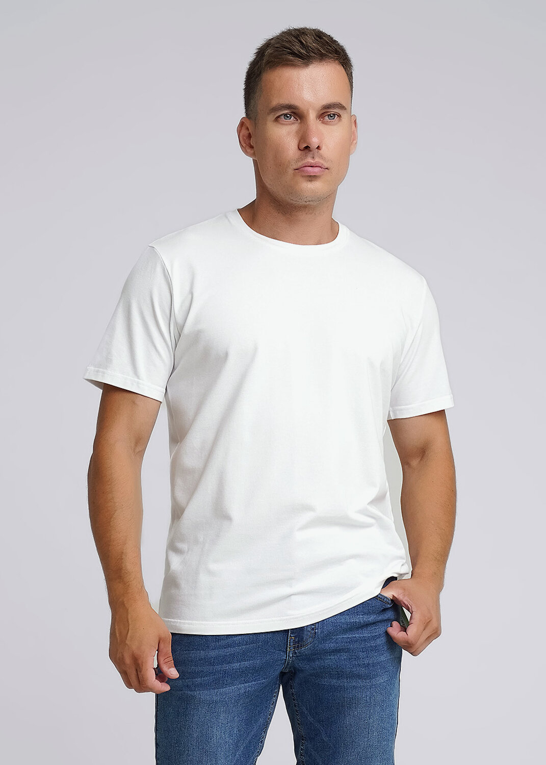 Базовая однотонная футболка стандартного объема с круглой горловиной, втачным рукавом из хлопкового полотна с добавлением эластана. Является неотъемлемой частью мужского гардероба.