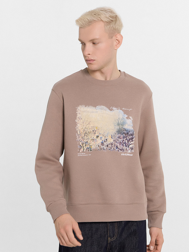 Новинка коллекции #ArtUwear — базовый мужской джемпер из трикотажного футера с теплым подчесом. Модель с печатью в виде картины Клода Моне "Бульвар Капуцинок". Длина до середины бедер, силуэт прямой. Линия плеча спущена. Рукава длинные, с притачными манжетами. Горловина круглой формы. В нем тепло и комфортно. Подходит для повседневной носки на работу, учебу или надеть на прогулку. Широкий размерный и цветовой ряд. Дополнить джемпер можно подходящим низом из коллекции одежды для мужчин. Отличный вариант для стильных городских образов!