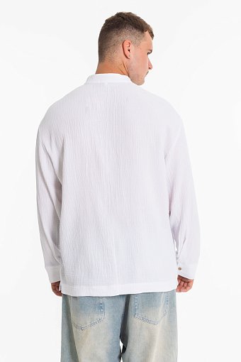 Мужская рубашка с длинным рукавом и спущенной линией плеча выполнена из муслина. Воротник-стойка, короткая застежка на пуговицы, внизу по бокам декоративные разрезы.