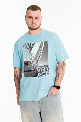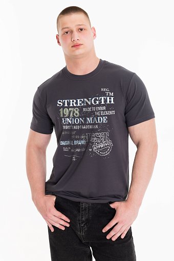 Мужская футболка с принтом выполнена из однотонного х/б полотна с лайкрой. Рукав короткий, втачной, горловина имеет круглый вырез.