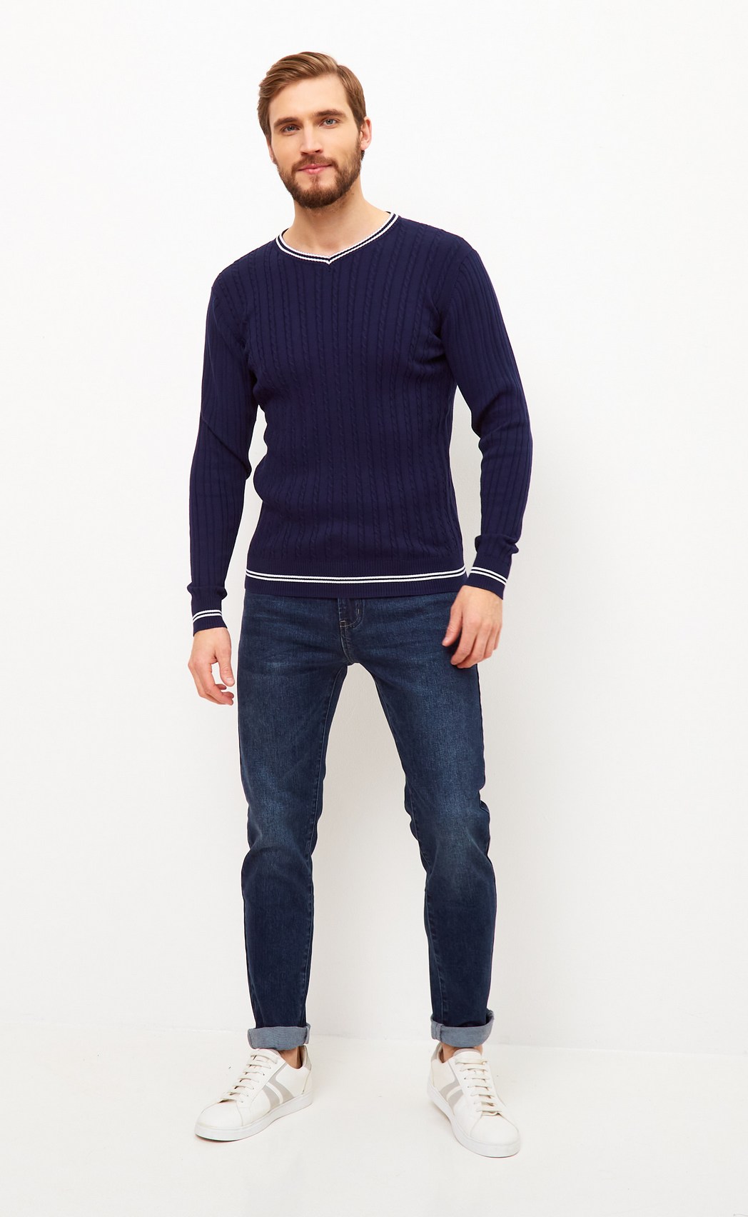 Мужской джемпер Fine Joyce из хлопкового полотна комбинированной вязки. Пуловер мужской с контрастной V-образной горловиной, резинкой по низу и отделкой рукавов. Модель комфортного прямого кроя из мягкого приятного на ощупь трикотажного полотна (100% хлопок) с антипиллинговым эффектом (не образуются катышки), не линяет, долгое время не теряет внешний вид, если стирать при температуре 30С. Благодаря удобству и универсальности этот джемпер найдет свое место в гардеробе любого мужчины. Мужской джемпер, пуловер, свитер, водолазка от бренда Fine Joyce – отличный вариант для повседневного стиля одежды, оптимальный выбор по цене и качеству. Для Вашего удобства в карточке товара есть фото с мерками.