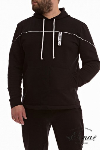 Толстовка из футер петли с лайкрой черного цвета. Рукав длинный, на манжете. Горловины круглая с планкой из кашкорсе. На левом рукаве карман на молнии с декоративной нашивкой.