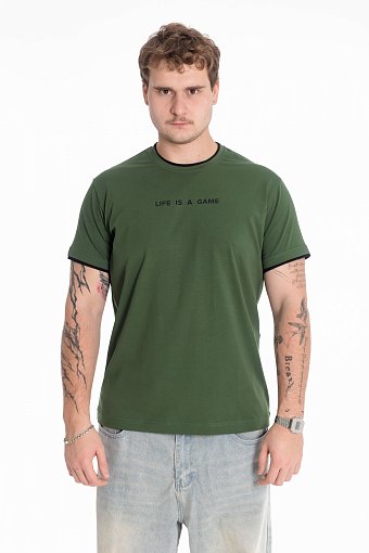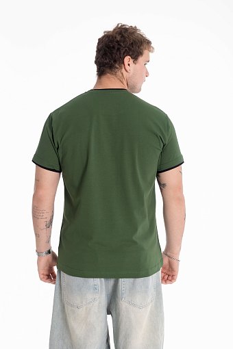 Мужская футболка с коротким рукавом выполнена из 100% хлопка двух цветов. Спереди на отделочной вставке расположен карман с принтом. По горловине и низу рукавов планки в цвет отделочного полотна.