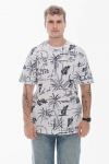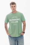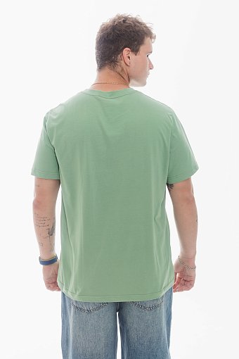Футболка мужская, выполнена из однотонной хлопковой ткани. Свободного кроя, короткий рукав. Горловина с круглым вырезом, отделанным планкой. Спереди нанесён принт.