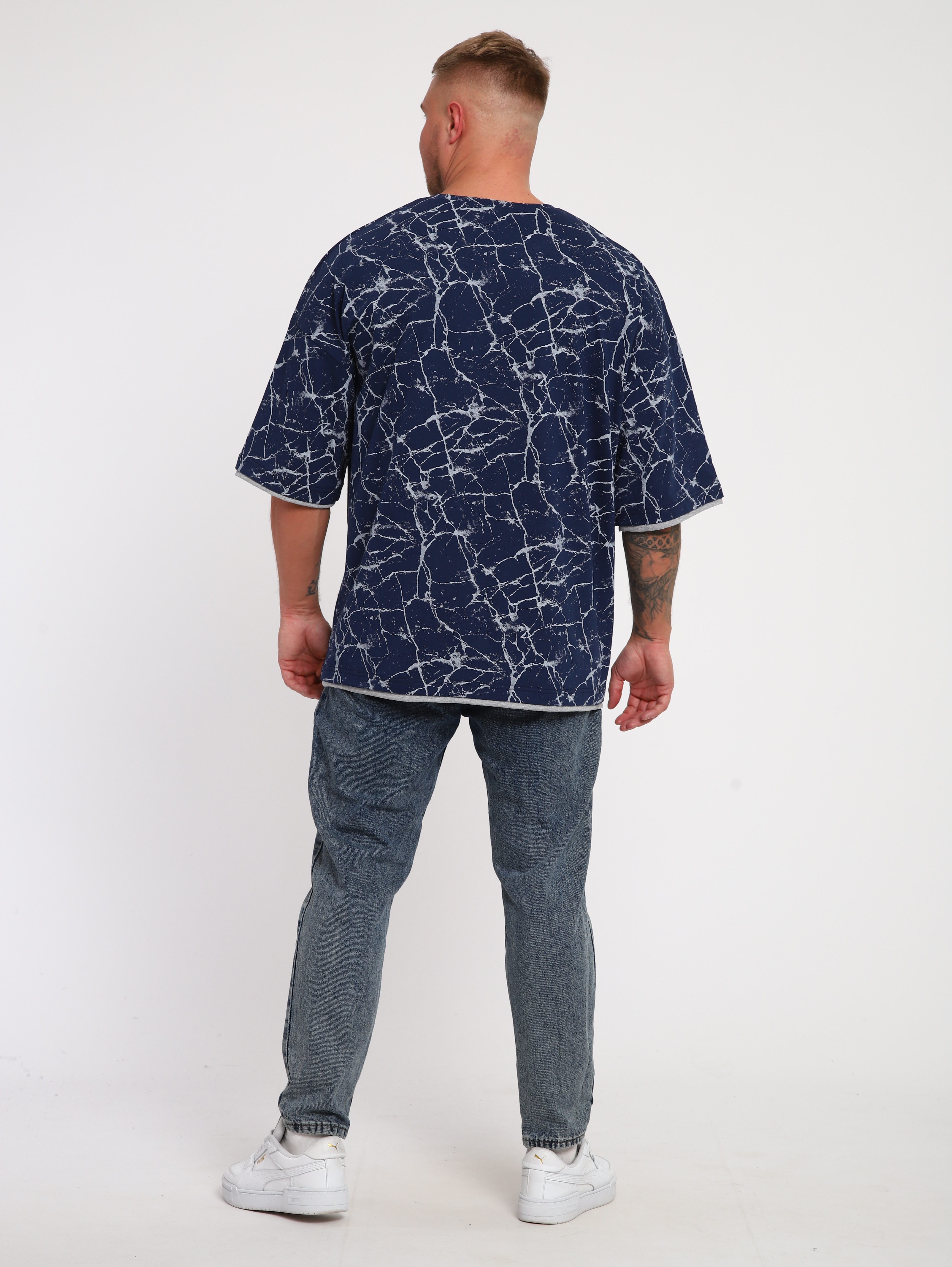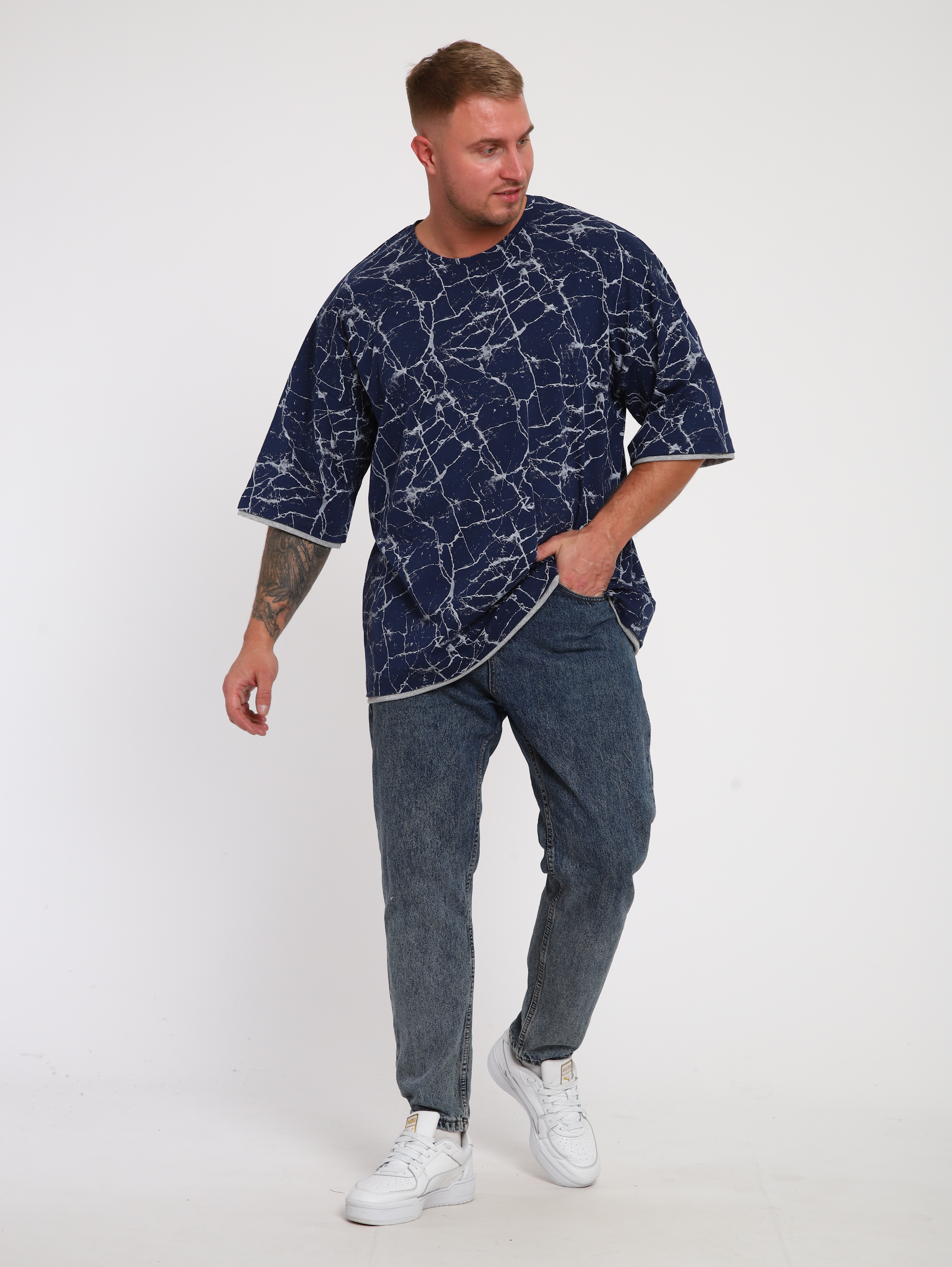 Мужская футболка в стиле oversaiz с контрастной отделкой на рукавах  и по низу футболки. Свободный крой, удлиненный втачной рукав и спущенное плечо подарит ощущение легкости и полную свободу движений. Ткань кулика с набивным рисунком.
