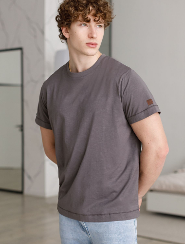 Футболка выполнена из фактурного полотна из 100% хлопка. Базовая однотонная модель, без труда впишется в любой гардероб. Ткань имеет характерный рисунок черточки за счет сочетания разных волокон хлопка 140-150 г. Хорошо держит форму и поддерживает комфортный микроклимат в течении дня. На рукаве нашивка из эко-кожи с логотипом бренда.