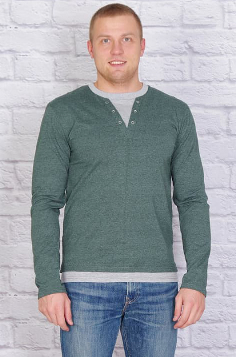 Стильная мужская футболка прямого кроя с длинным рукавом из кулирки с добавлением пэ нити. Модель сложная - имитирует "двойку", по горловине декоративные клёпки. Хорошо сочетается с джинсами. Ткань меланжированная, мягкая, практичная и не требует сложного ухода.