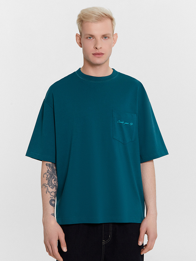 Футболка свободная укороченная, оверсайз. Горловина округлой формы обработана обтачкой из рибаны. Рукава втачные, корткие. Линия плеча спущена. На детали переда накладной карман (мод 111899-1). Нижние срезы футболки и рукавов обработаны швом вподгибку.