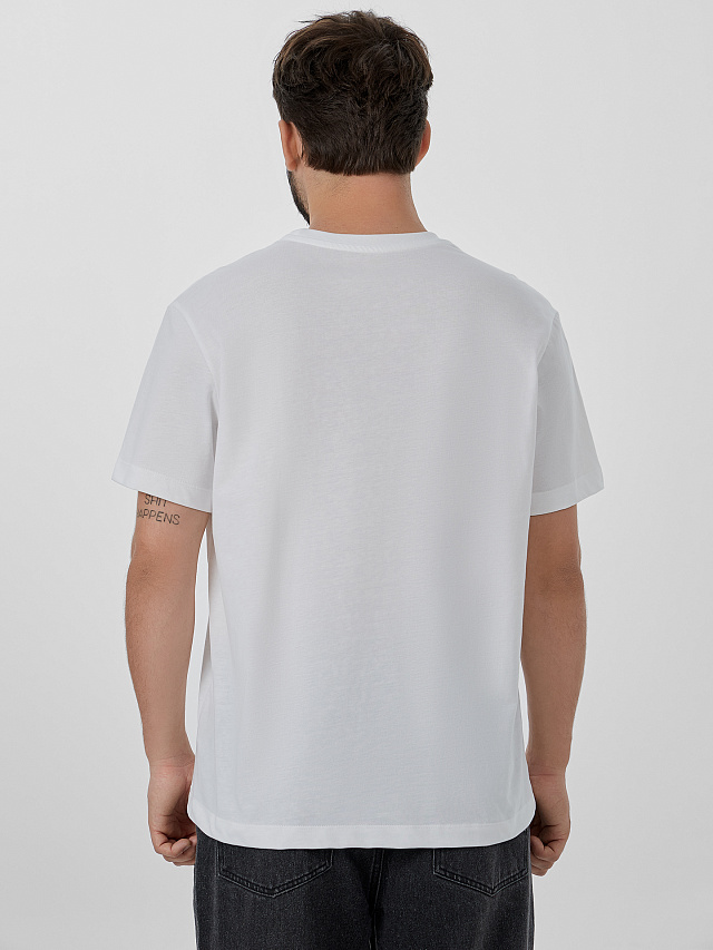 Нижние срезы футболки и рукавов обработаны швом вподгибку.