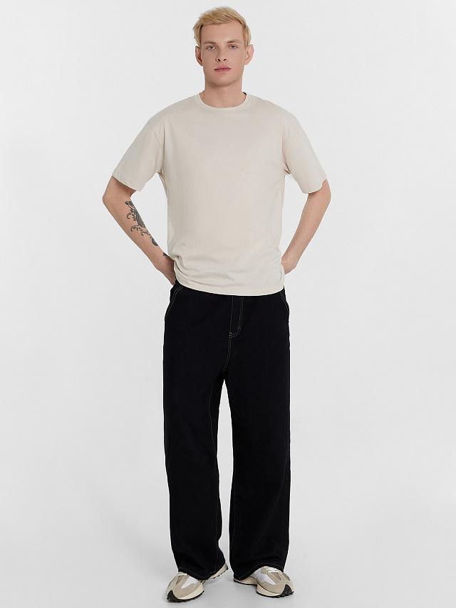 Мужская однотонная футболка — удачное вложение в ваш базовый гардероб. Модель свободного силуэта с круглой горловиной и спущенным плечом создаёт стильный и современный образ. Углублённая пройма и рукава длиной чуть выше локтя обеспечивают комфорт и свободу движений. Изделие выполнено из хлопковой кулирки, что делает футболку мягкой, приятной на ощупь и отлично пропускающей воздух. Эта футболка идеально подходит для повседневной носки, обеспечивая комфорт и стиль в любой ситуации.