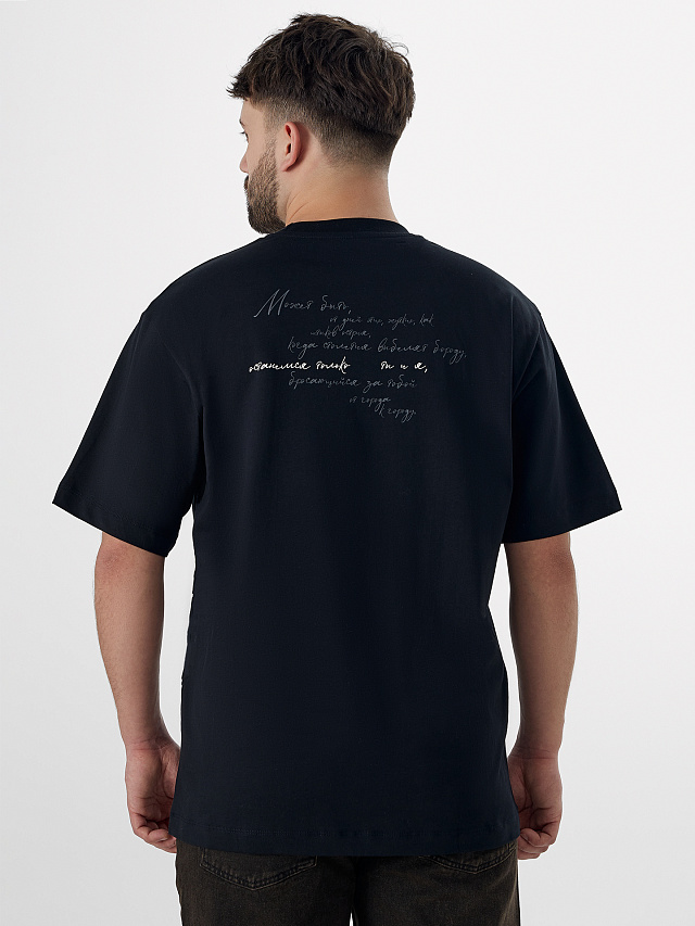 Футболка мужская черная с отрывком из поэмы Владимира Маяковского - это цитата, которая добавляет образу интеллектуальную глубину и индивидуальность. Каждое слово становится графическим акцентом, который говорит о вашей связи с литературой, смелости мысли и внимании к мощному художественному слову.