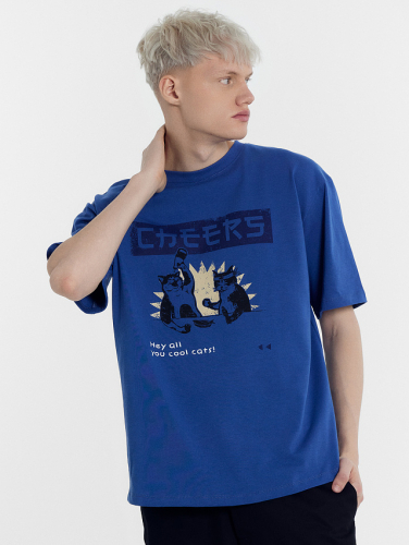 Стильная коллекционная мужская футболка в однотонной расцветке с печатью в виде котов и надписи "Cheerrs - Hey all - You cool cats / Ваше здоровье - Вы все - классные коты". Модель полностью состоит из натурального 100% хлопка. Изделие свободного силуэта со слегка спущенным плечом, длиной до линии бедер. Горловина круглой формы, рукава короткие. Отличный вариант для повседневной носки, спорта и активного отдыха. В линейке широкий размерный и цветовой ряд. Рекомендуем!