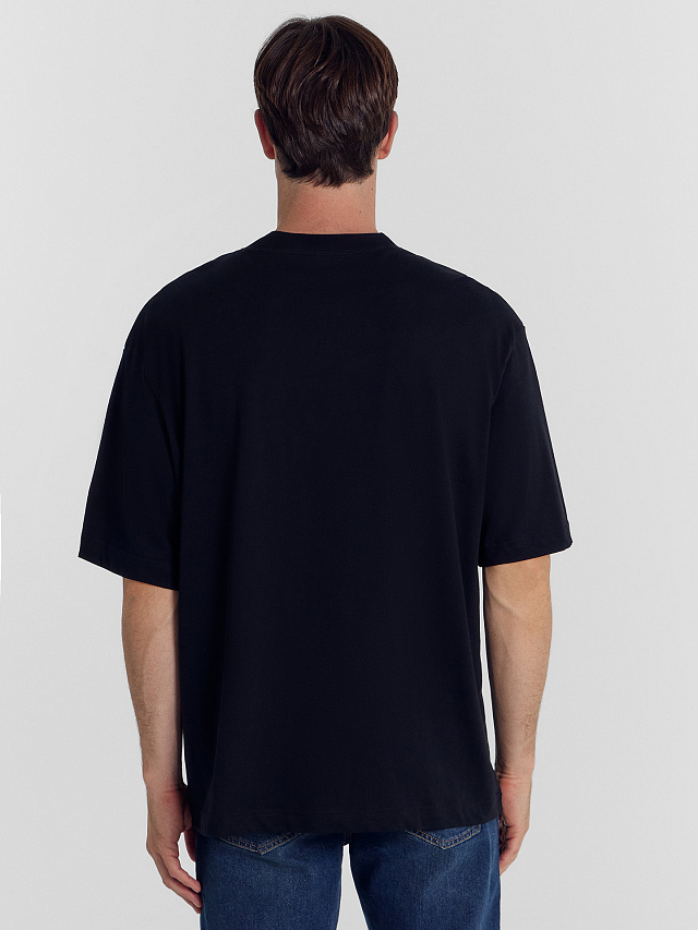 Футболка свободная укороченная, оверсайз. Горловина округлой формы обработана обтачкой из рибаны. Рукава втачные, корткие. Линия плеча спущена. На детали переда накладной карман (мод 111899-1). Нижние срезы футболки и рукавов обработаны швом вподгибку.