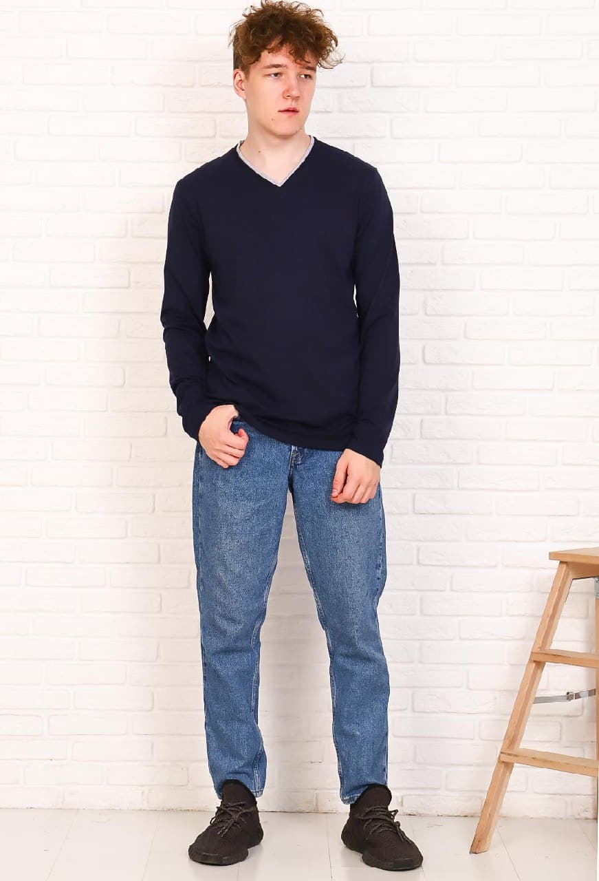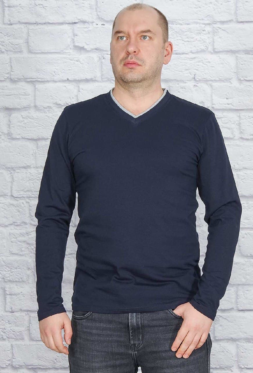 Стильная однотонная футболка с длинным рукавом и V - образным вырезом. Отделка горловины из рибаны контрастных цветов добавляет изюминку модели.