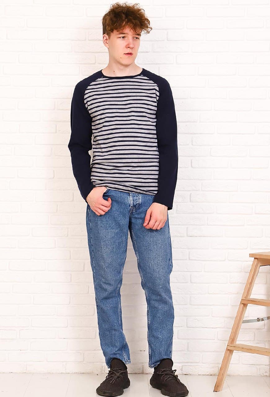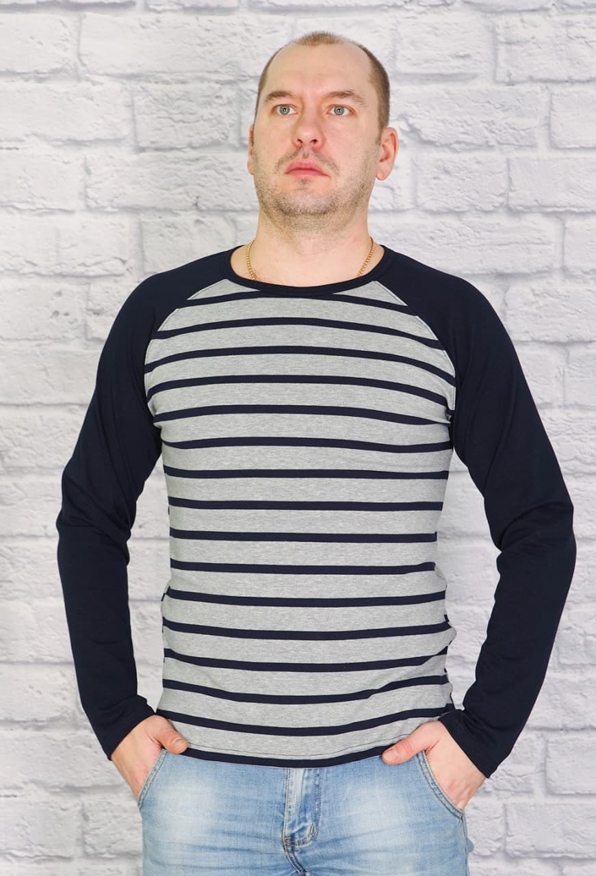 Стильный лонгслив прямого кроя классического дизайна в полоску. Удобный рукав реглан из контрастной однотонной ткани. Модель из эластичной, мягкой и приятной к телу рибаны, рукава - кулирка пенье с лайкрой, высокого качества. Футболка отлично сидит на любой фигуре, а эффектное сочетание тканей, несомненно, положительно оценят все мужчины.
