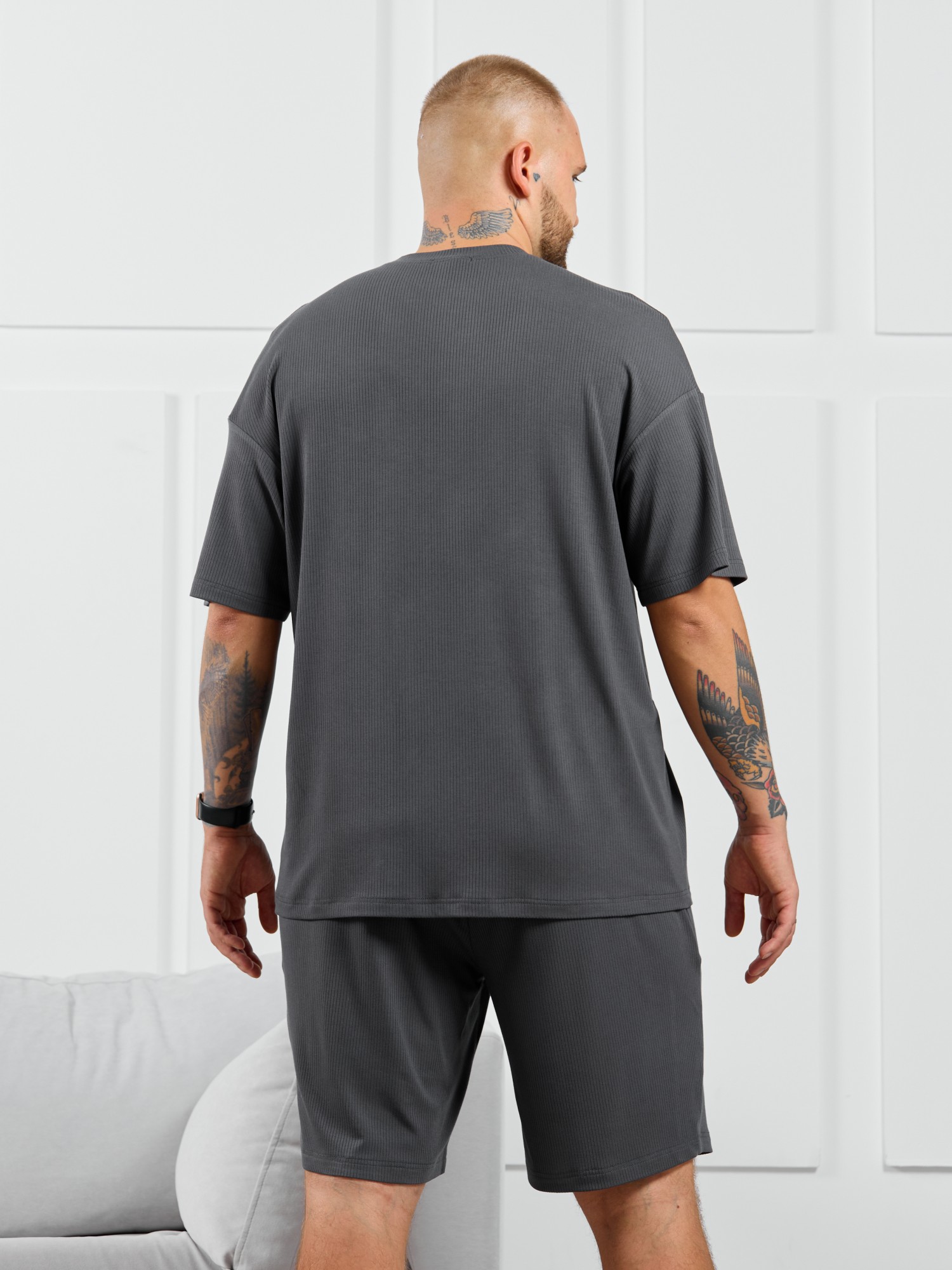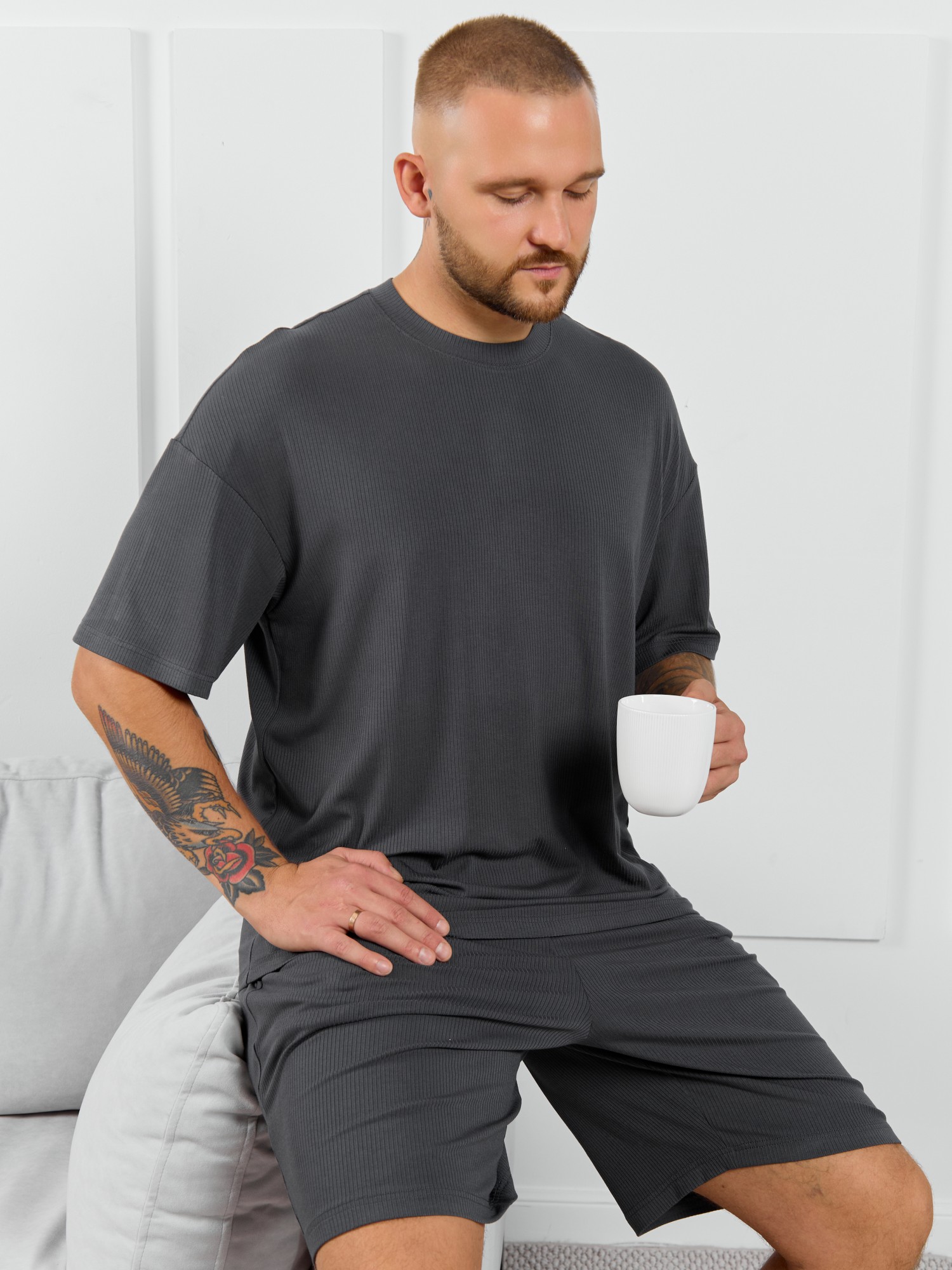 Футболка мужская из пластичного однотонного трикотажного полотна в рубчик, приятного к телу. Модель свободная, со спущенной линией плеч, рукавами длиной до локтя. Может подойти для отдыха, прогулок и занятий спортом.