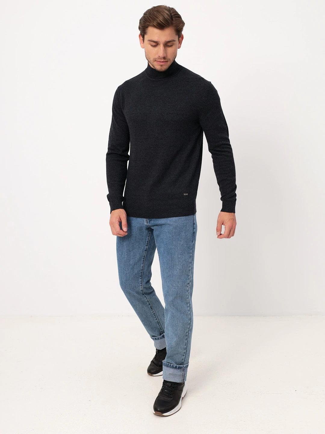 Цвет: Серый Рисунок: Трикотаж одн..показатьотонный Состав: 50% шерсть мерс. 46%акрил 4% кашемир Модель: Классическая Ворот: Полугольф Силуэт: Прямой силуэт / Сlassic fitотонный