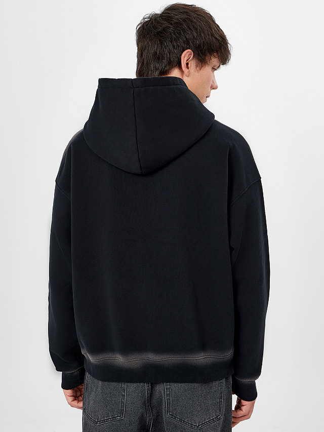 Теплое черное худи мужское с капюшоном — это идеальный выбор для прохладной погоды. Модель выполнена из мягкого футера с начесом, который сохраняет тепло и дарит ощущение уюта. Прямой силуэт со слегка спущенной линией плеч обеспечивает свободу движений, а капюшон со средним швом надежно защищает от ветра.