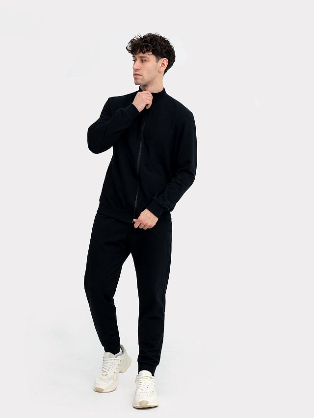 Комплект изготовлен из трикотажного полотна футер. Жакет прямого силуэта, длиной до середины бедер. Горловина округлой формы с воротником стойкой из рибаны. Рукав втачной, длинный с отрезными манжетами.
