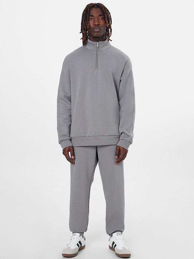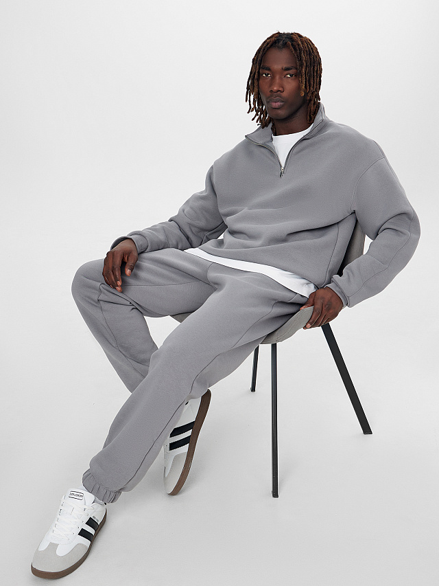 Серый мужской костюм из мягкого футера с начесом создан для повседневного комфорта в прохладную погоду. Гармоничный набор из толстовки и брюк обеспечивает удобство во время прогулок, отдыха дома или неформальных встреч.