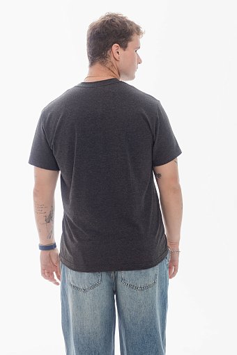 Футболка мужская, выполнена из однотонной хлопковой ткани с добавлением лайкры. Футболка с коротким рукавом и горловиной с круглым вырезом, отделанной планкой. Спереди нанесён принт.