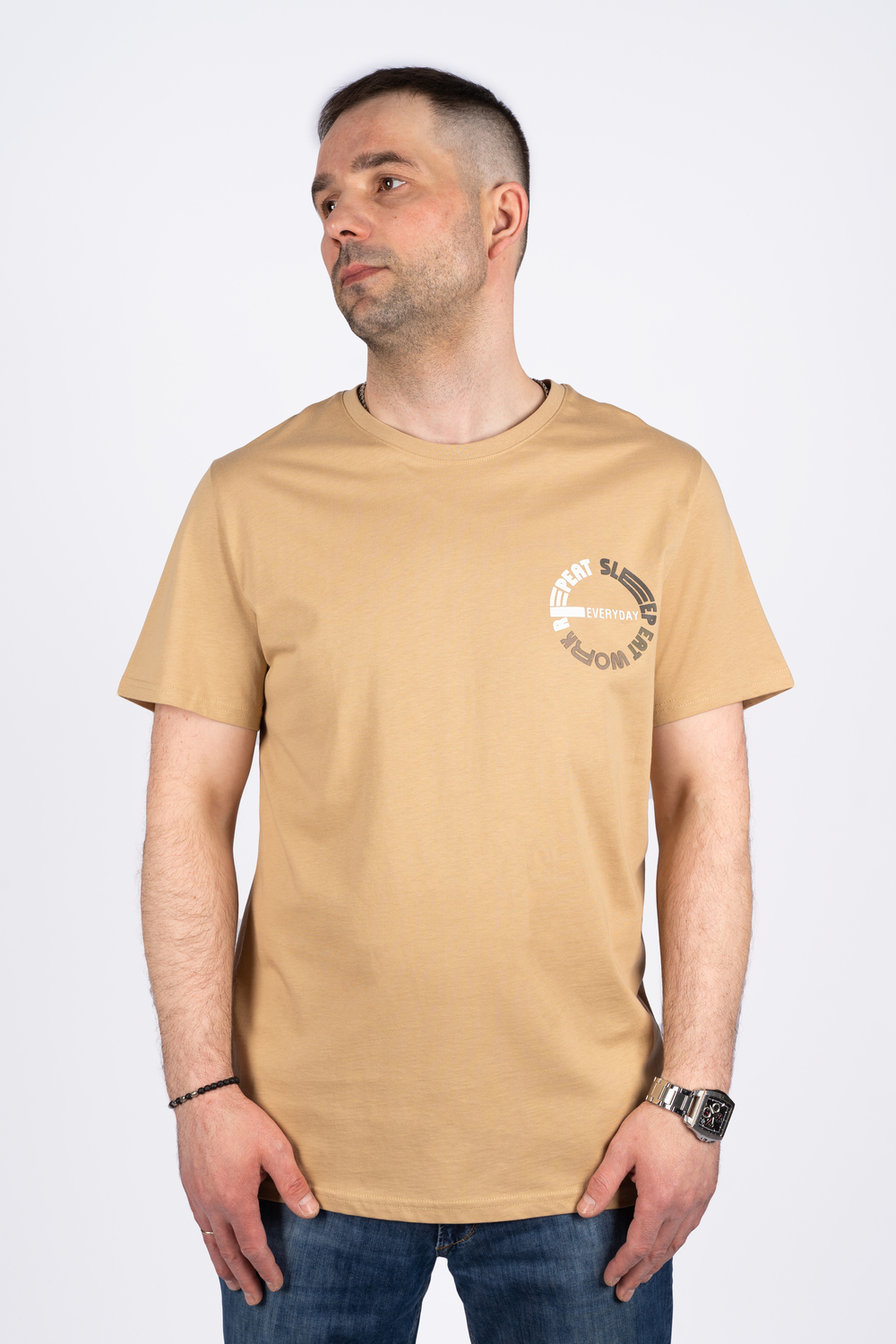 Мужская футболка с принтом для настоящих трудоголиков! Ешь, спи, работай - девиз на каждый день для тех, кто стремится к своим целям, внимательно относится к дисциплине и обязательно добьется всего, чего хочет! Сделана из мягкого трикотажа, который выдержит множество стирок. Прямой силуэт футболки, втачной рукав, горловина круглая, обработана воротником из рибаны. Горловина спинки внутри укреплена настрочной планкой из кулирки. Низ изделия и рукавов обработан швом в подгибку. На полочке принт шелкография.