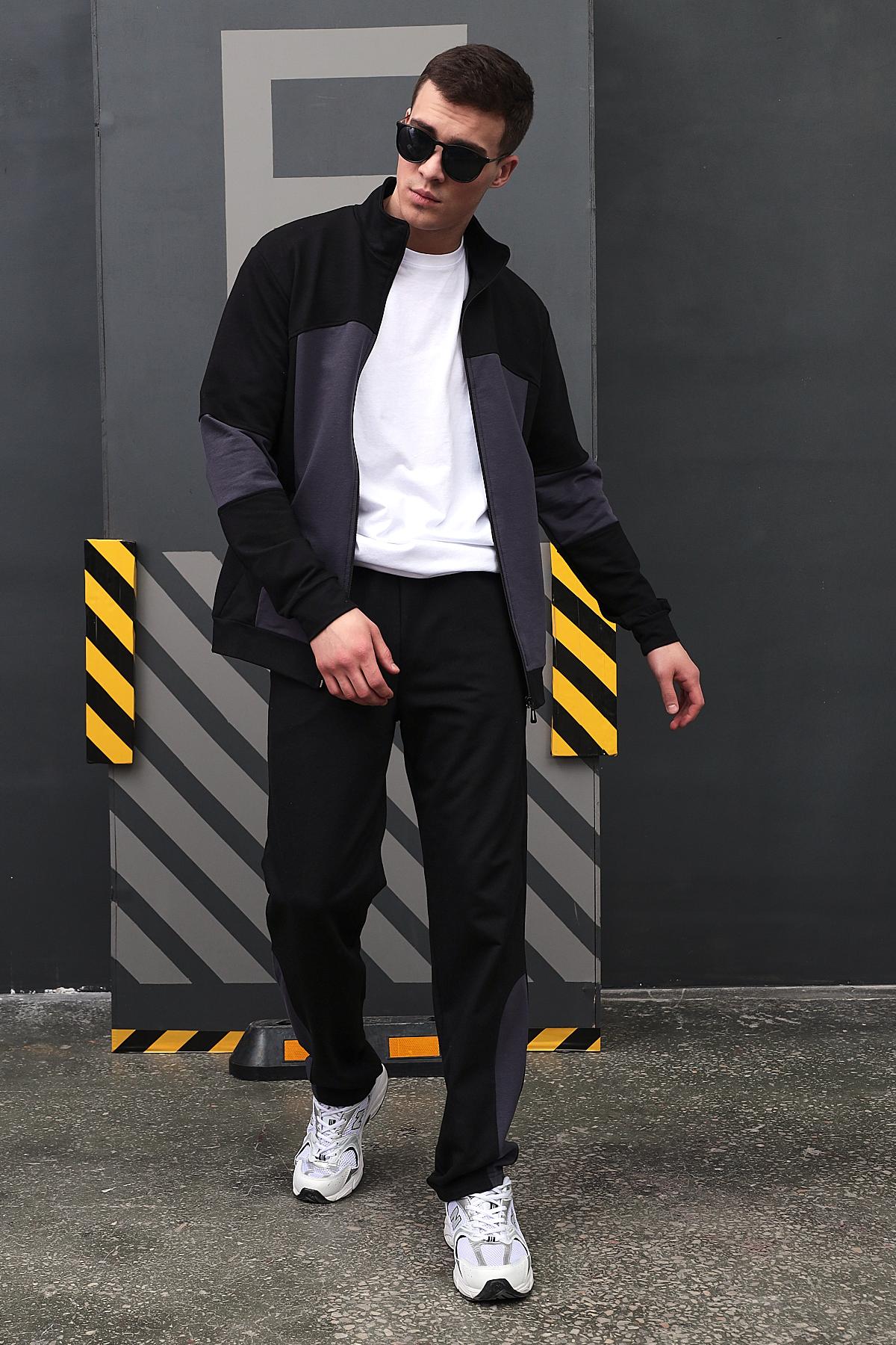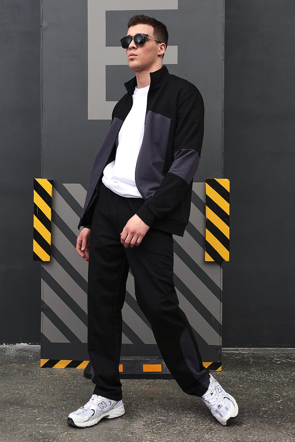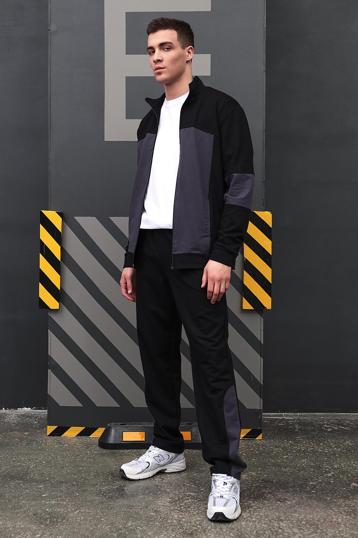 Мужской спортивный костюм из хлопкового трикотажа. В комплекте костюма куртка на манжетах и свободные прямые брюки. Воротник куртки - стойка, полочка и рукава выполнены оригинальным образом комбинацией тканей, застёжка на молнии. Куртка и брюки с удобными карманами. Брюки на поясной резинке, выполнены из однотонного цвета. Модель костюма свободного покроя, не сковывает движений. Такой костюм прекрасно подойдёт как для спорта, так и для отдыха.