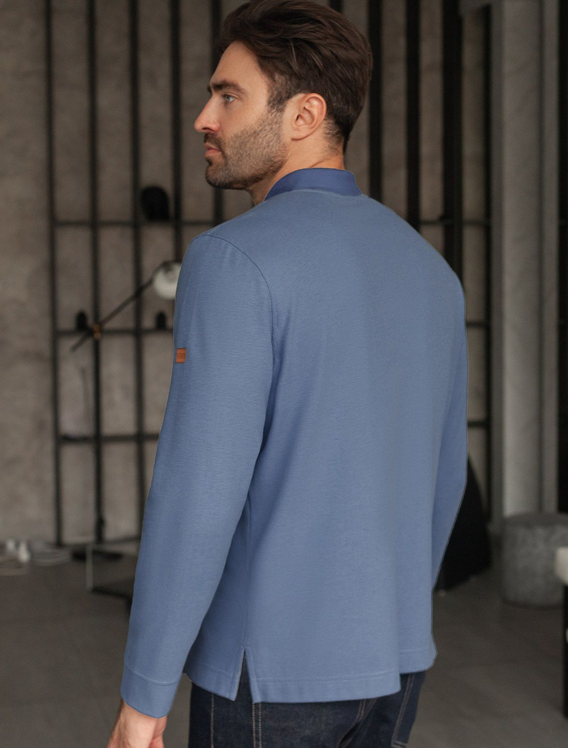 Стильный лонгслив светло-синего цвета с плетеным воротником поло с застежкой на молнию выполнен из премиального хлопка в сочетании с эластаном .Невероятно мягкая ткань из натуральных волокон - она едва ощутима на коже и словно обнимает тело. Материал при касании кажется бархатистым, при движении он словно повторяет все мельчайшие линии фигуры. По свойствам материал сочетает в себе практичность и нежность: отлично провускает воздух, сохраняя ощущение свежести в течение всего дня, при этом созраняет тепло в прохладную погоду.Идеально подходит для чувствительной кожи, не вызывает раздражения и дискомфорта. Удобный отложной воротник делает образ современным и стильным, а длинные рукава с манжетами защищают руки при ветреной погоде.