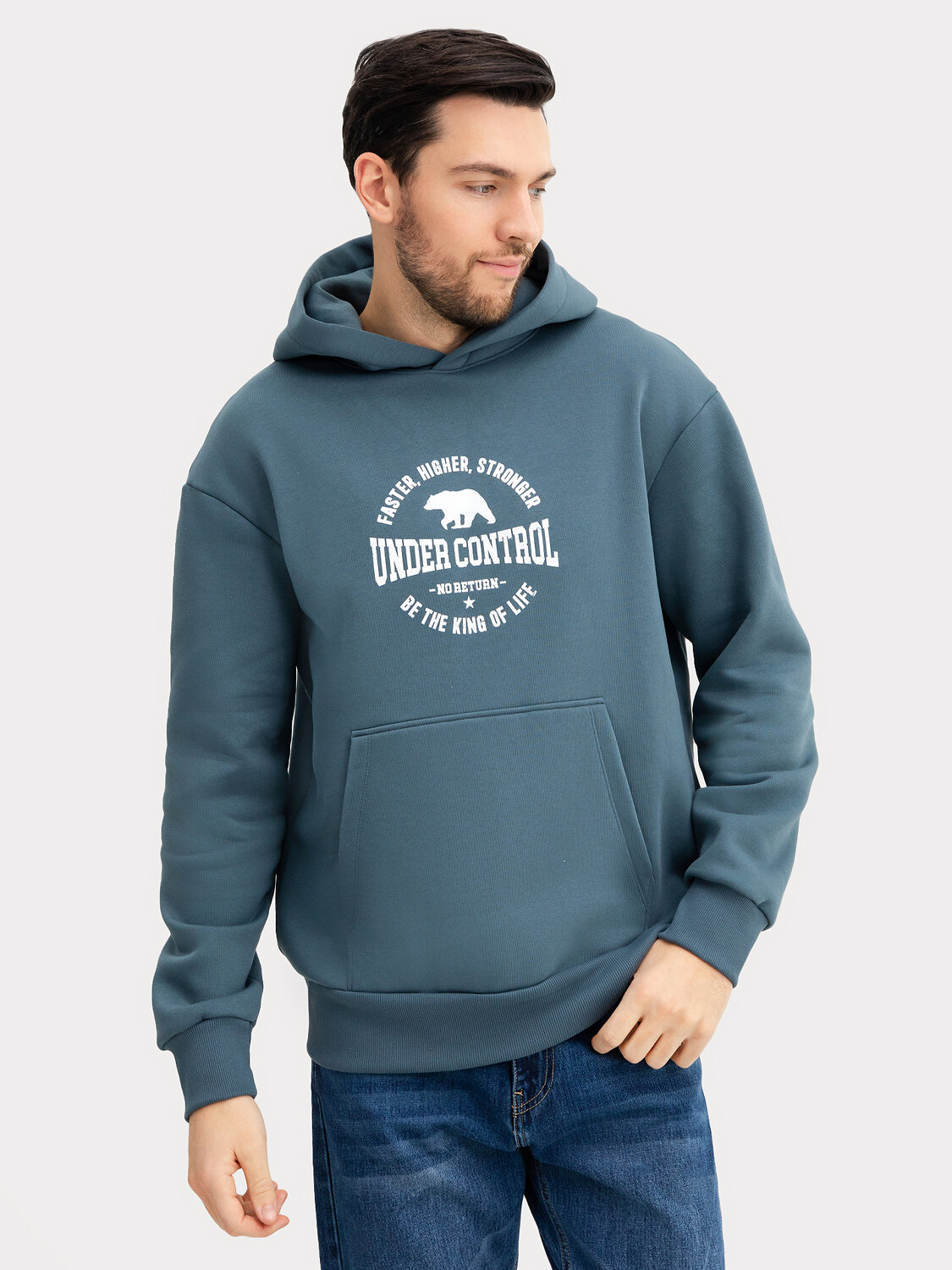 Мужское худи свободного силуэта из трикотажного футера с теплым подчесом. Круглая горловина с капюшоном, длинные рукава на манжетах, слегка спущенная линия плеча, пояс из рибаны – худи удачно сочетает комфортный дизайн и отличное качество!