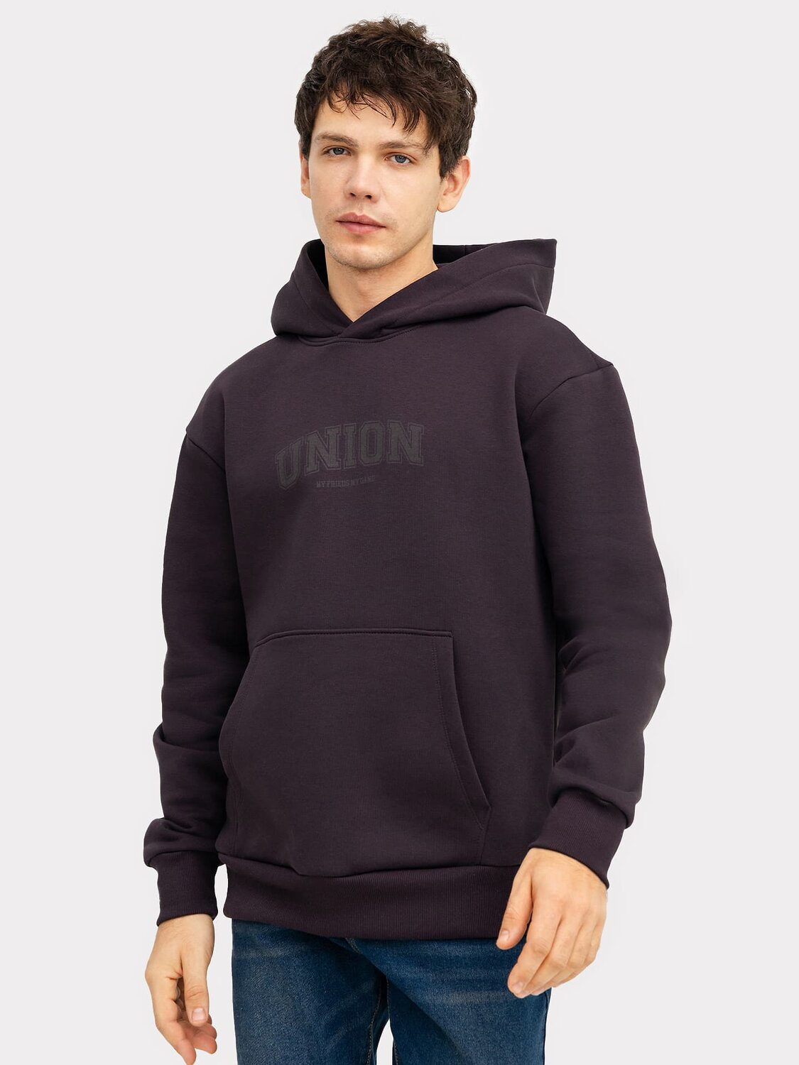 Мужское худи свободного силуэта из трикотажного футера с теплым подчесом. Круглая горловина с капюшоном, длинные рукава на манжетах, слегка спущенная линия плеча, пояс из рибаны – худи удачно сочетает комфортный дизайн и отличное качество!