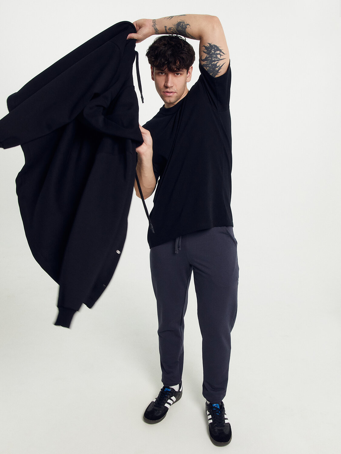 Мужские однотонные брюки для дома, отдыха и спорта. Выполнены из приятного к телу трикотажного полотна. Облегание свободное, длина классическая. Штанины на манжетах. Внутренние карманы на подкладке. Широкий пояс с эластичной тесьмой и регулировочным шнуром. Комфортная модель!