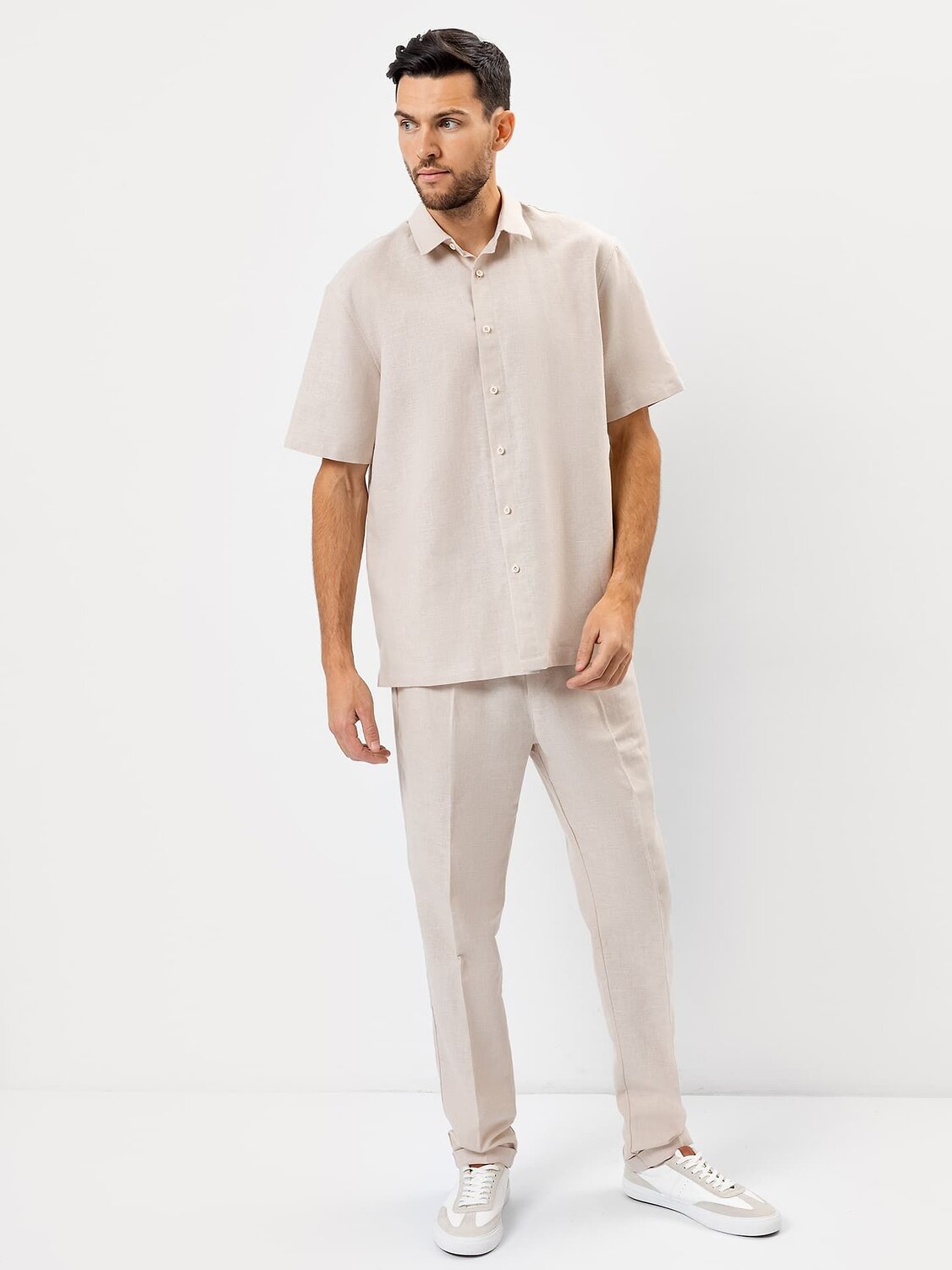 Стильные мужские брюки из премиального льна и хлопка. Силуэт свободный, слегка заужен к низу. Пояс – с эластичной тесьмой внутри и шнуром-завязкой, с помощью которого можно регулировать ширину в поясе. Есть удобные боковые карманы-хулиганы. Гульфик – имитация. Нижние края брюк отвернуты. Рекомендуем!