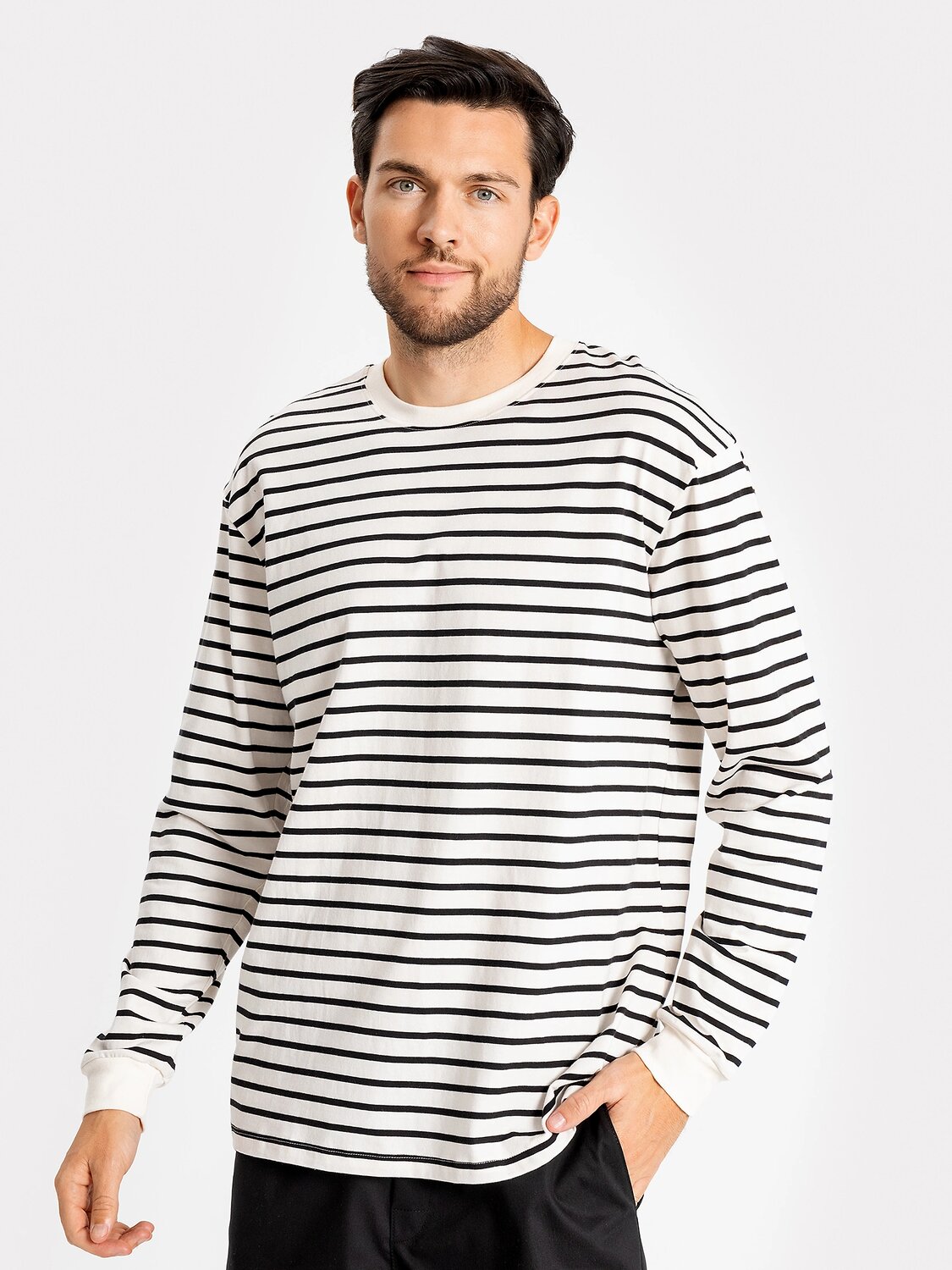 Стильный мужской лонгслив-тельняшка прямого, свободного силуэта, выполнен из высококачественного хлопка. Вырез круглый, классический, с контрастной окантовкой. Рукава длинные, свободные, с расширенными манжетами. Отличный универсальный лонгслив для casual-образов на каждый день. Дополнить такой джемпер мужской в полоску легко и просто стильным низом из линейки базовой одежды для мужчин. Ее можно носить самостоятельно как отдельный предмет одежды, или дополнить верхней одеждой, создав при этом модный многослойный вариант. Материал изделия износостойкий, мягкий и приятный к телу, не линяет и не выцветает при множественных стирках. Если вы в поиске базовой универсальной вещи — тельняшка мужская отличный вариант. Купить джемпер-тельняшку для мужчин можно на сайте и в магазинах розничной сети Mark Formelle!