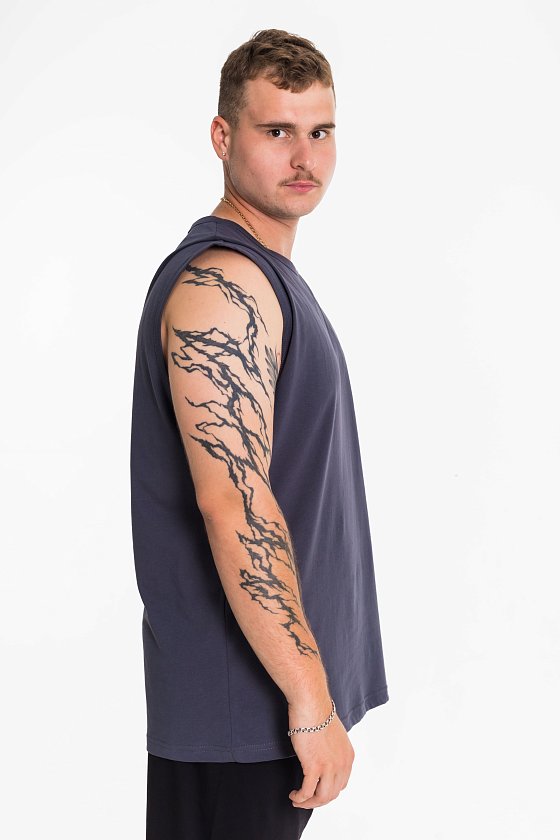 Майка с широким плечом выполнена из однотонной кулирки, 100% хлопок. Круглая горловина и проймы обработаны широкой бейкой. Спереди расположен принт.