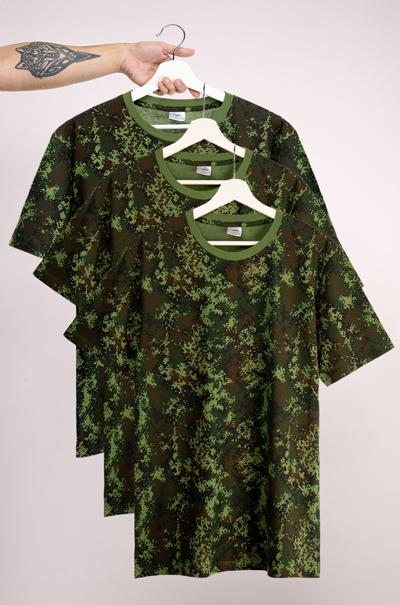 Хлопковые футболки с камуфляжным принтом Цифра представлены в защитной темно-зеленой расцветке, в комплекте 3 штуки. Футболка из трикотажа для мужчин подойдет для страйкбола и использования в рабочих профессиях.
