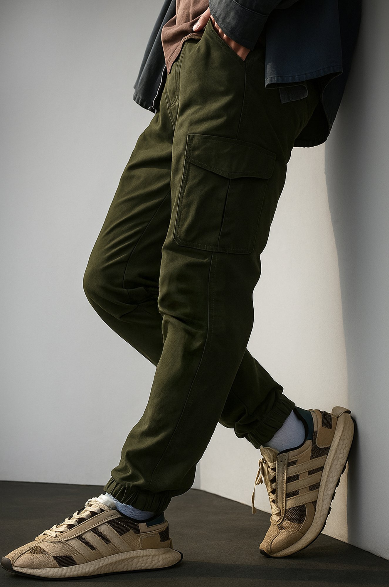 Мужские брюки джоггеры в стиле карго защитного цвета — универсальный выбор для динамичных и уверенных образов. Практичные и удобные, они легко вписываются в спортивный стиль и повседневные комбинации.
